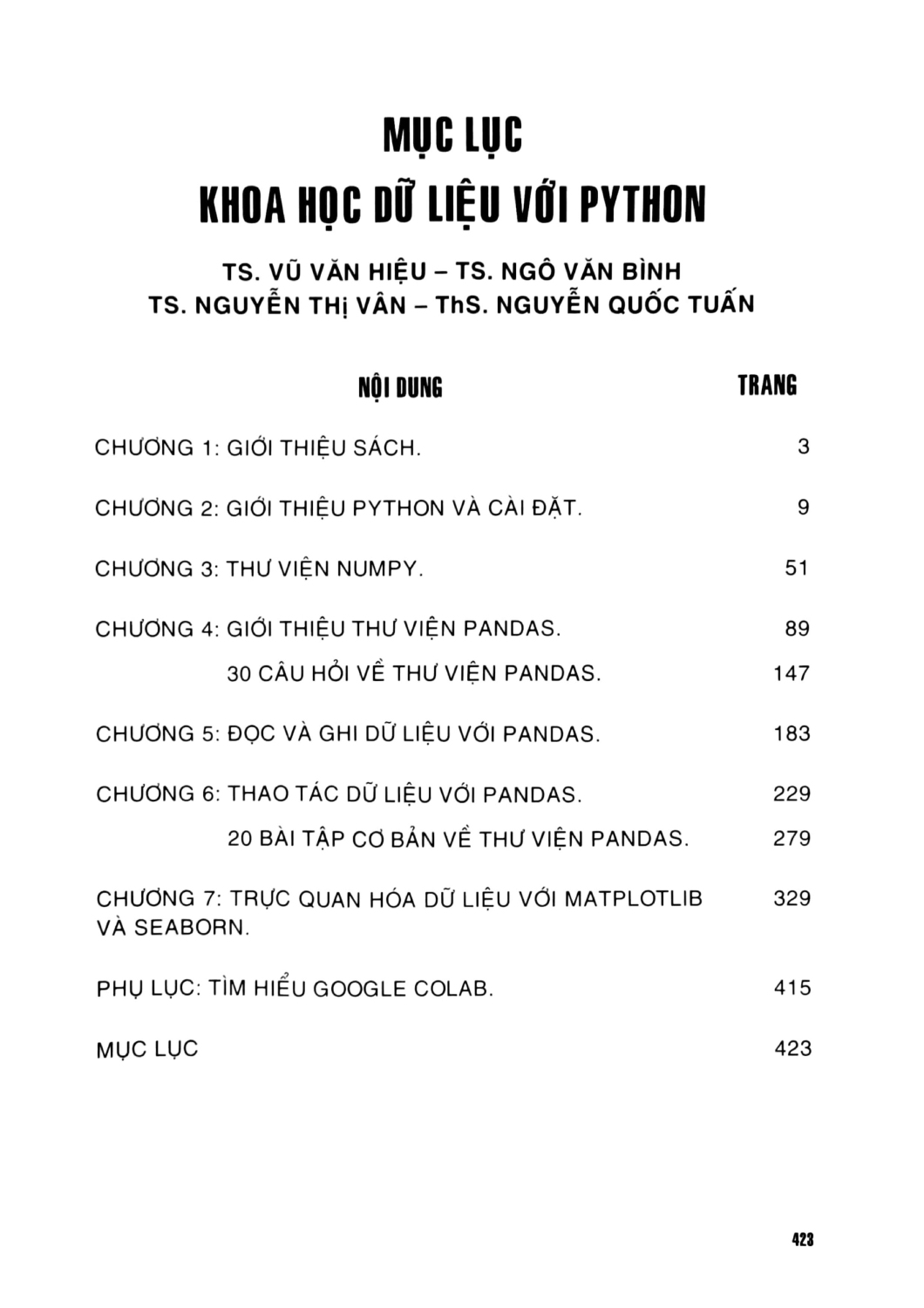 Khoa Học Dữ Liệu Với Python Sách Khoa học dữ liệu với Python được trình bày với 424 trang khổ 16 x 24 cm qua 7 chương và 1 phụ lục: Chương 1: Giới thiệu