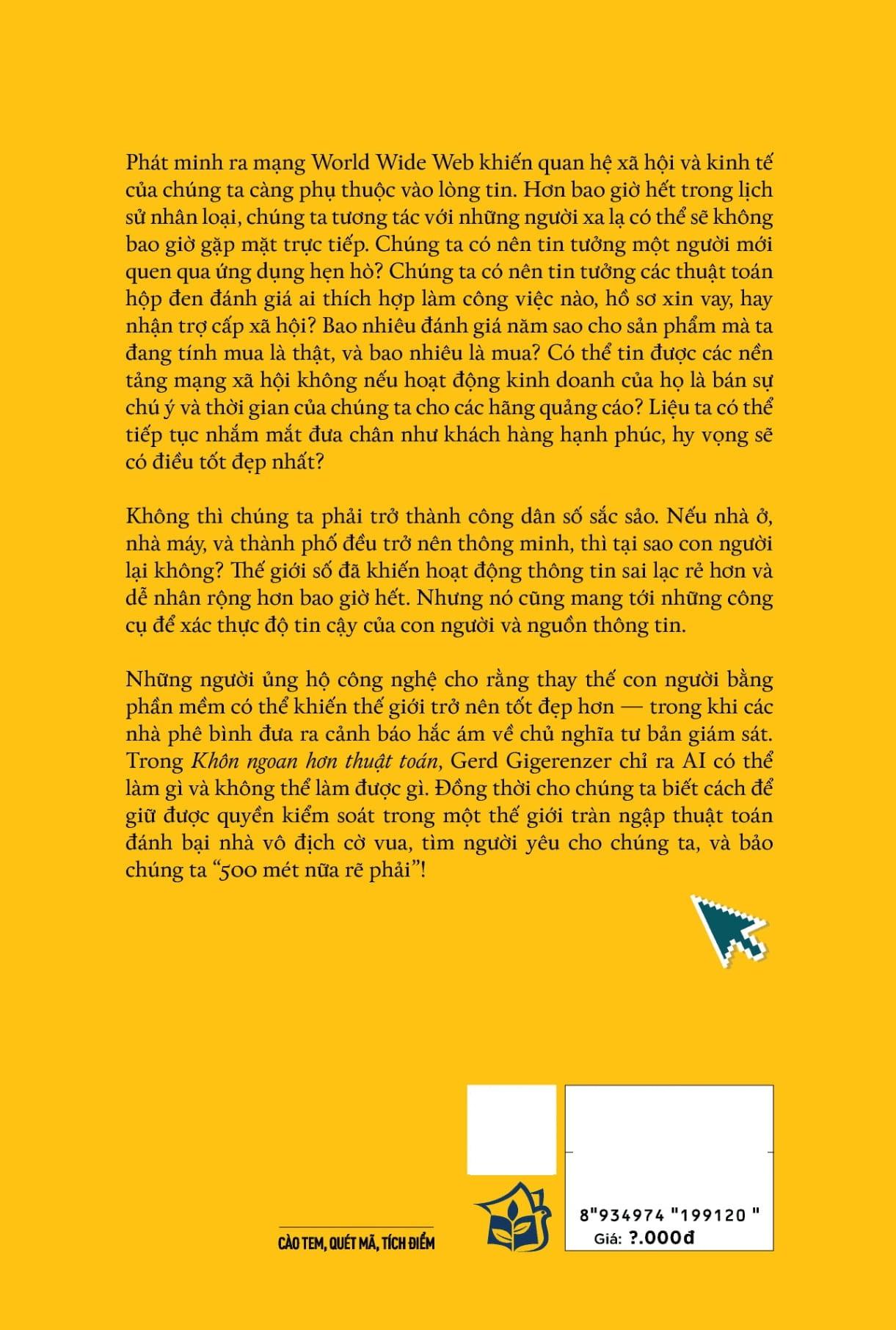 Các nhà tiên tri ngày tận thế do công nghệ dự đoán robot sẽ thống trị thế giới, cho con người ngửi khói. Những người ủng hộ công nghệ cho rằng thay thế con người bằng phần mềm có thể khiến thế giới trở thành một nơi tốt đẹp hơn — trong khi các nhà phê bình cảnh báo hắc ám về chủ nghĩa tư bản giám sát. Mặc dù khác biệt quan điểm về tương lai, họ đều nhất trí: máy móc sẽ sớm làm mọi việc tốt hơn con người. Trong Khôn ngoan hơn thuật toán, Gerd Gigerenzer chỉ ra lý do tại sao điều đó không đúng và cho chúng ta biết cách để có thể kiểm soát trong một thế giới có nhiều thuật toán.