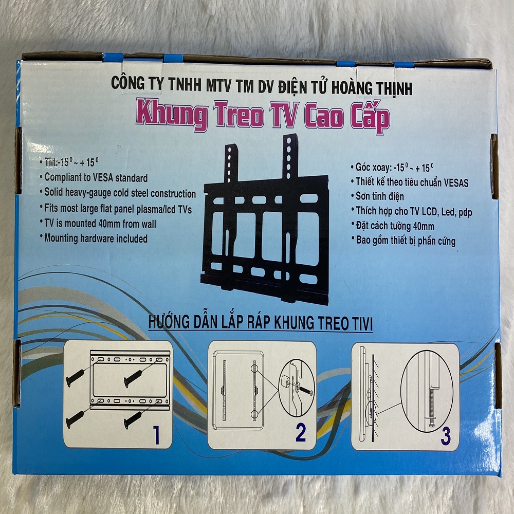 Khung treo phù hợp với mọi tivi có kích thước 19 - 43 inch. Kích thước: Ngang 390mM - Cao 270 mm. Tải trọng: 40 kG Khoảng cách tivi đến tường 40mm-50mm Linh kiện đầy