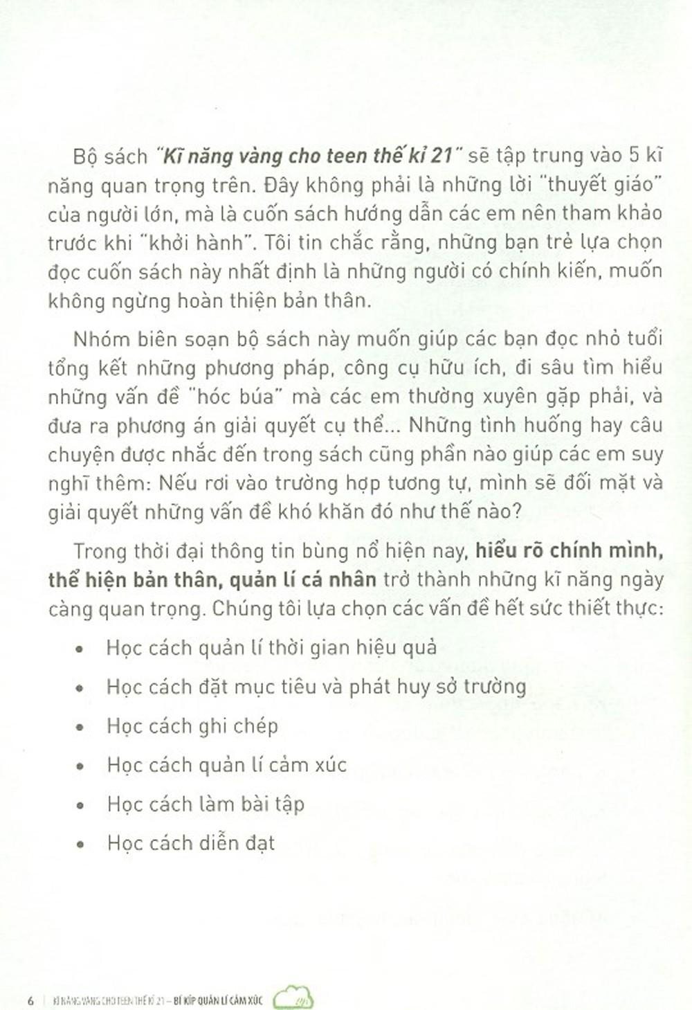Tuổi teen là giai đoạn phát triển vô cùng lí thú. Học hỏi kiến thức, hiểu bản thân và trau dồi khả năng học tập khác nhau là nhiệm vụ quan trọng nhất của những người trẻ tuổi. Bộ sách này tập trung vào cuộc sống và tình trạng học tập của học sinh phổ thông cơ sở và phổ thông trung học, tìm ra những vấn đề mà các bạn trẻ hay gặp nhất, những kĩ năng cần thiết nhất. Các chuyên gia hàng đầu trong nhiều lĩnh vực đã xây dựng bộ sách “Kĩ năng vàng cho teen thế kỉ 21” với những nội dung và giải pháp phù hợp, để độc giả trẻ không chỉ giải quyết được những vấn đề của hiện tại, mà còn bồi đắp nền tảng cơ bản cho các hoạt động suốt đời người.