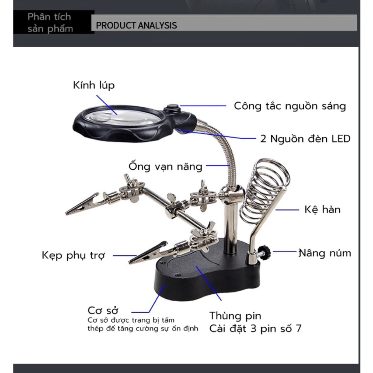 Thông Tin Sản Phẩm: Kính Lúp Soi Kẹp Hàn Mạch Điện Tử Có Đèn LED - Loại Tốt, Rất Chắc Chắn