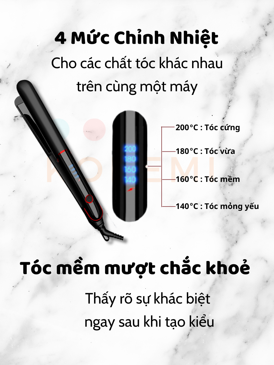 - Sản phẩm KOREMI có dán tem Bảo Hành ĐiệnTử, tem chống hàng giả Vui lòng kích hoạt bảo hành để bảo đảm quyền lợi của bạn. KOREMI ước mong được phục vụ Bạn. MÁY ÉP DUỖI TÓC CAO CẤP KIỂU HÀN QUỐC Koremi NA-8868 ( Phiên bản cải tiến mới 2022 vượt trội hơn, tiện lợi hơn) · Chiếc máy ép duỗi tóc Koremi NA-8868 được sản xuất theo công nghệ hiện đại tiên tiến từ Hàn Quốc kết hợp 2 chức năng vừa làm xoăn khi uốn tóc, vừa làm thẳng tóc khi duỗi. Với chiếc máy uốn duỗi tóc này bạn sẽ thoải mái khi ép duỗi tóc hay uốn xoăn tóc mà không lo máy bị quả tải và chờ lâu như khi bạn sử dụng máy ép loại mini. Tấm gia nhiệt dài tiện dụng giúp bạn tiết kiệm thời gian gấp 5 lần Đèn LED thông báo mức nhiệt đang hoạt động. Dây điện xoay 360 độ cùng Nút POWER trong thân máy gọn gàng khi thao tác. Máy nóng nhanh chỉ trong 10 giây, với công nghệ độc quyên PTC từ Hàn Quốc tạo được nhiệt độ nóng đều không bị vượt ngưỡng giúp bảo vệ được mái tóc của bạn. Thanh gia nhiệt kết hợp cùng lớp phủ Ceramic Tourmaline giúp mái tóc bạn chống hư tổn tuyệt đối. Gốm là vật liệu tốt và tiên tiến nhất hiện nay được ứng dụng trong các thiết bị làm tóc gia nhiệt PTC giúp bảo vệ và tránh hư tổn tối đa cho mái tóc của bạn. Giúp kẹp tóc nhanh, kéo tóc không bị rít, và không làm dứt tóc. Bổ sung gấp đôi lượng ion âm giúp bảo vệ lớp biểu bì của tóc, tránh làm lớp biểu bì bong tróc do tiếp xúc với nhiệt, từ đó duy trì độ ẩm và làm tóc suôn mượt. *** ️ Chúng Tôi Cam Kết 100% Sản Phẩm Đều Được Bảo Hành Chính Hãng: 1 đổi 1 với tất cả lỗi của nhà sản xuất trong thời gian 3 tháng ( Quý khách cũng có thể mua thêm gói bảo hành) Đặc điểm kỹ thuật: Có 4 mức chỉnh nhiệt: (140 ° C - 200 ° C). Phù hợp cho mọi loại tóc : Mềm, Thường, Dày, Khô Sử dụng cho cả 2 loại tóc ướt và Khô : Duỗi tóc thẳng / Uốn tóc xoăn / khóa bên trong và bên ngoài Công suất định mức: 35W Điện áp định mức: 110v-220v Tần số định mức: 50Hz/ 60Hz Bảo vệ quá nhiệt: Có ( Tự tắt sau 60 phút) Nhiệt độ tăng nhanh: 10S và ổn định Bảng điều khiển: Nút bấm ON/OFF tiện lợi Lớp men phủ gốm: Gốm Tourmaline giúp chống hư tổn tuyệt đối. Lựa chọn màu: đen / trắng / hồng Phương pháp gia nhiệt: Phần tử gia nhiệt PTC theo công nghệ tiên tiến độc quyền từ Hàn Quốc Trọng lượng tịnh của sản phẩm: 350G Chiều dài dây: 1,8M