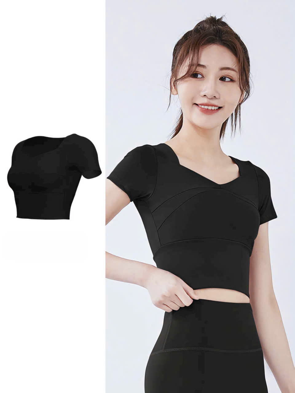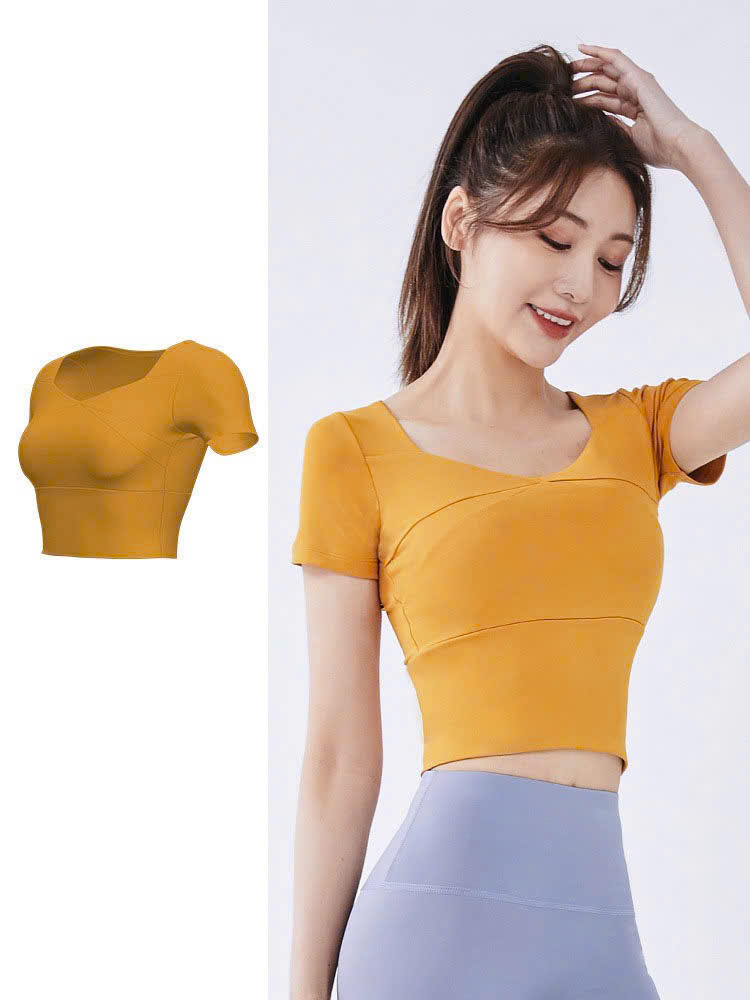 Thiết kế 2 trong 1: Áo croptop ôm dáng + đệm ngực tích hợp, không cần mặc thêm bra thể thao.