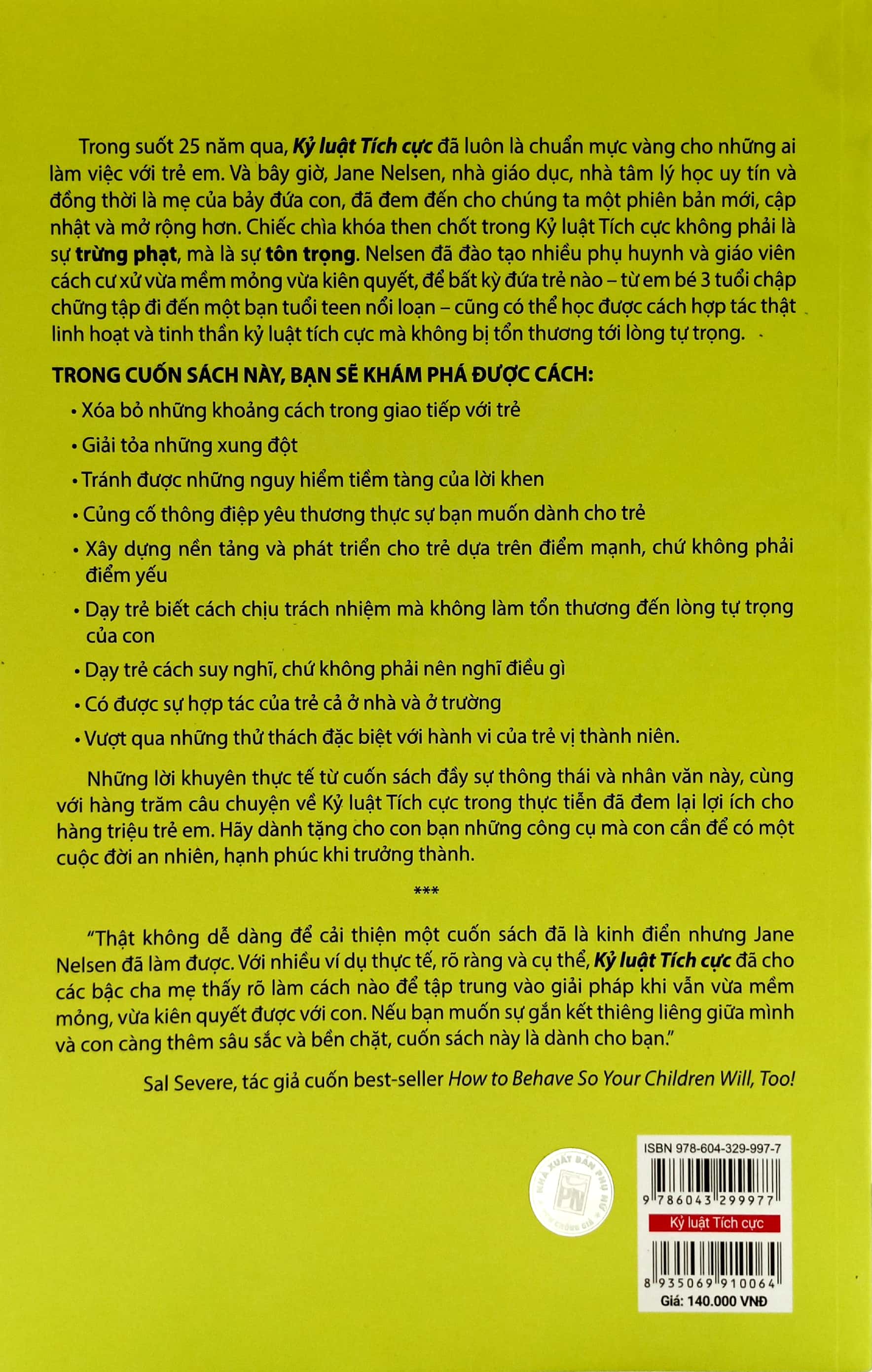 Trong suốt 25 năm qua, Kỷ Luật Tích Cực đã luôn là chuẩn mực vàng cho những ai làm việc với trẻ em.Và bây giờ, Jane Nelsen, nhà giáo dục, nhà tâm lý học uy tín và đồng thời là mẹ của bảy đứa con, đã đem đến cho chúng ta một phiên bản mới, cập nhật và mở rộng hơn. Chiếc chìa khóa then chốt trong Kỷ Luật Tích Cực không phải là sự trừng phạt, mà là sự tôn trọng. Nelsen đã đào tạo nhiều phụ huynh và giáo viên cách cư xử vừa mềm mỏng vừa kiên quyết, để bất kỳ đứa trẻ nào – từ em bé 3 tuổi chập chững tập đi đến một bạn tuổi teen nổi loạn – cũng có thể học được cách hợp tác thật linh hoạt và tinh thần kỷ luật tích cực mà không bị tổn thương tới lòng tự trọng.