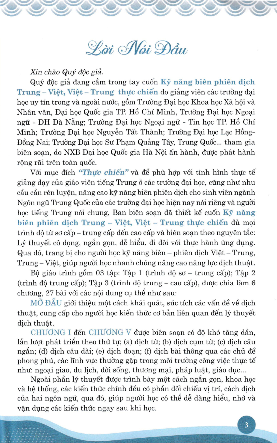 Kỹ Năng Biên Phiên Dịch Trung - Việt, Việt - Trung Thực Chiến - Tập 3 Quý độc giả đang cầm trong tay Kỹ Năng Biên Phiên Dịch Trung – Việt, Việt – Trung thực chiến do giảng viên các trường đại học uy tín trong nước, gồm trường Đại học Khoa học Xã hội và Nhân văn, Đại học Quốc gia TP. HCM, Trường Đại học Ngoại ngữ - ĐH Đà Nẵng; Trường Đại học Ngoại ngữ - Tin học TP. HCM; Trường Đại học Nguyễn Tất Thành; Trường Đại học Lạc Hồng- Đồng Nai; Trường Đại học Văn Lang; Trường Đại học Kinh tế - Tài chính TP. HCM; Trường Đại học Phenika... tham gia biên soạn, do NXB Đại học Quốc gia Hà Nội ấn hành, được phát hành rộng rãi trên toàn quốc.
