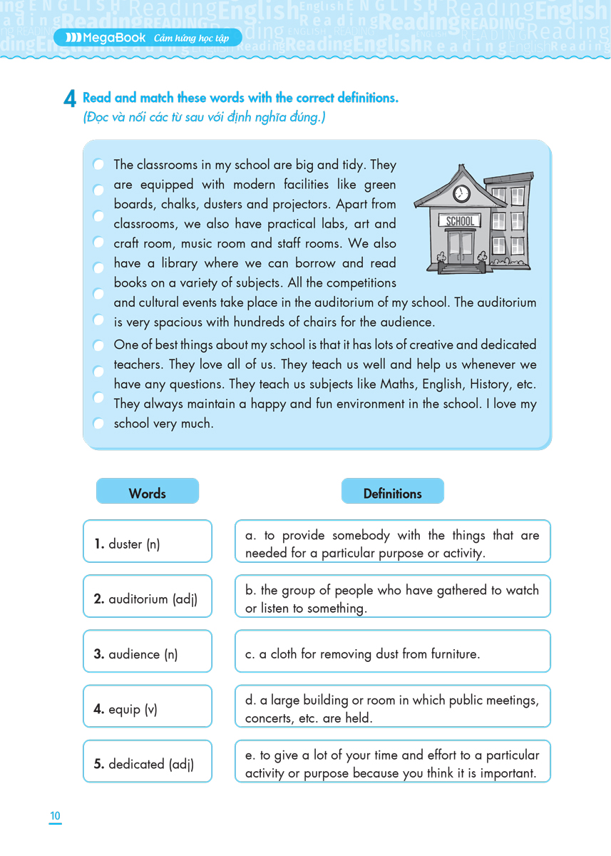 - Nội dung kiến thức bám sát khung chương trình của Bộ Giáo dục và Đào tạo Cuốn sách giúp các em nắm vững kiến thức đã học trên lớp cũng như ôn luyện thêm các bài tập nâng cao, hỗ trợ quá trình tự học tiếng Anh hiệu quả, giới thiệu các kỹ năng đọc hiểu với hướng dẫn từng bước cụ thể, giúp học sinh dễ dàng ghi nhớ và vận dụng.