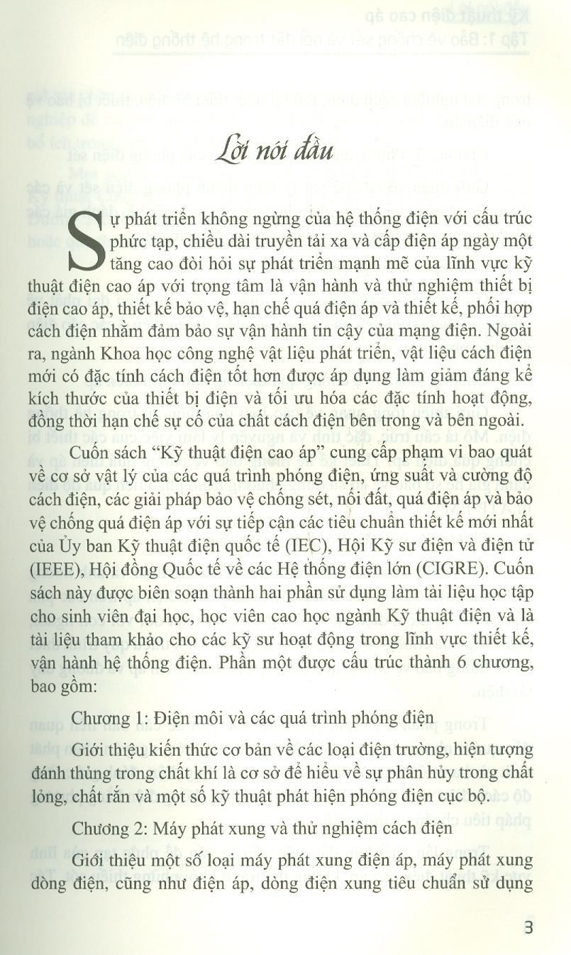 Cuốn sách cung cấp phạm vi bao quát về cơ sở vật lý của các quá trình phóng điện, ứng suất và cường độ cách điện, các giải pháp bảo vệ chống sét, nối đất,