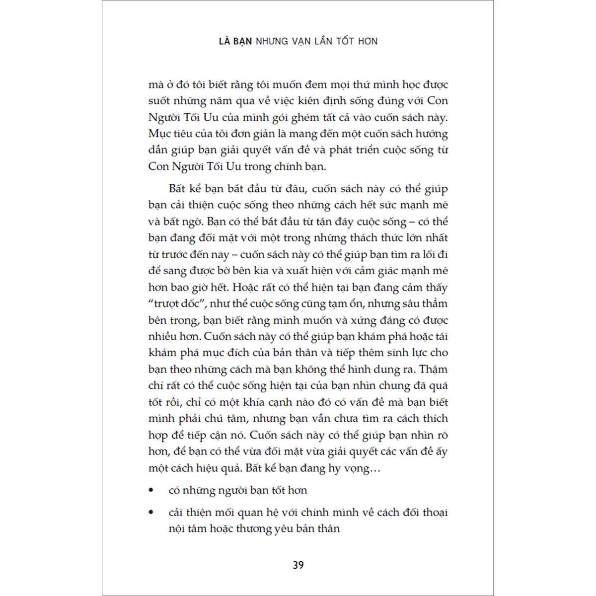 Bayer không quan trọng bạn bắt đầu từ đâu - dù cho bạn đang ở dưới đáy vực sâu; đang đối mặt với những chông gai, thách thức của cuộc đời; hay cả khi cuộc sống của bạn đã hoàn toàn ổn, chỉ một khía cạnh nào đó muốn cải thiện – bạn hoàn toàn có thể đạt đến một cuộc đời mà mình mơ ước. Chỉ cần bạn có niềm tin, “Là bạn nhưng vạn lần tốt hơn” sẽ cung cấp cho bạn bộ công cụ để thực hiện điều này.