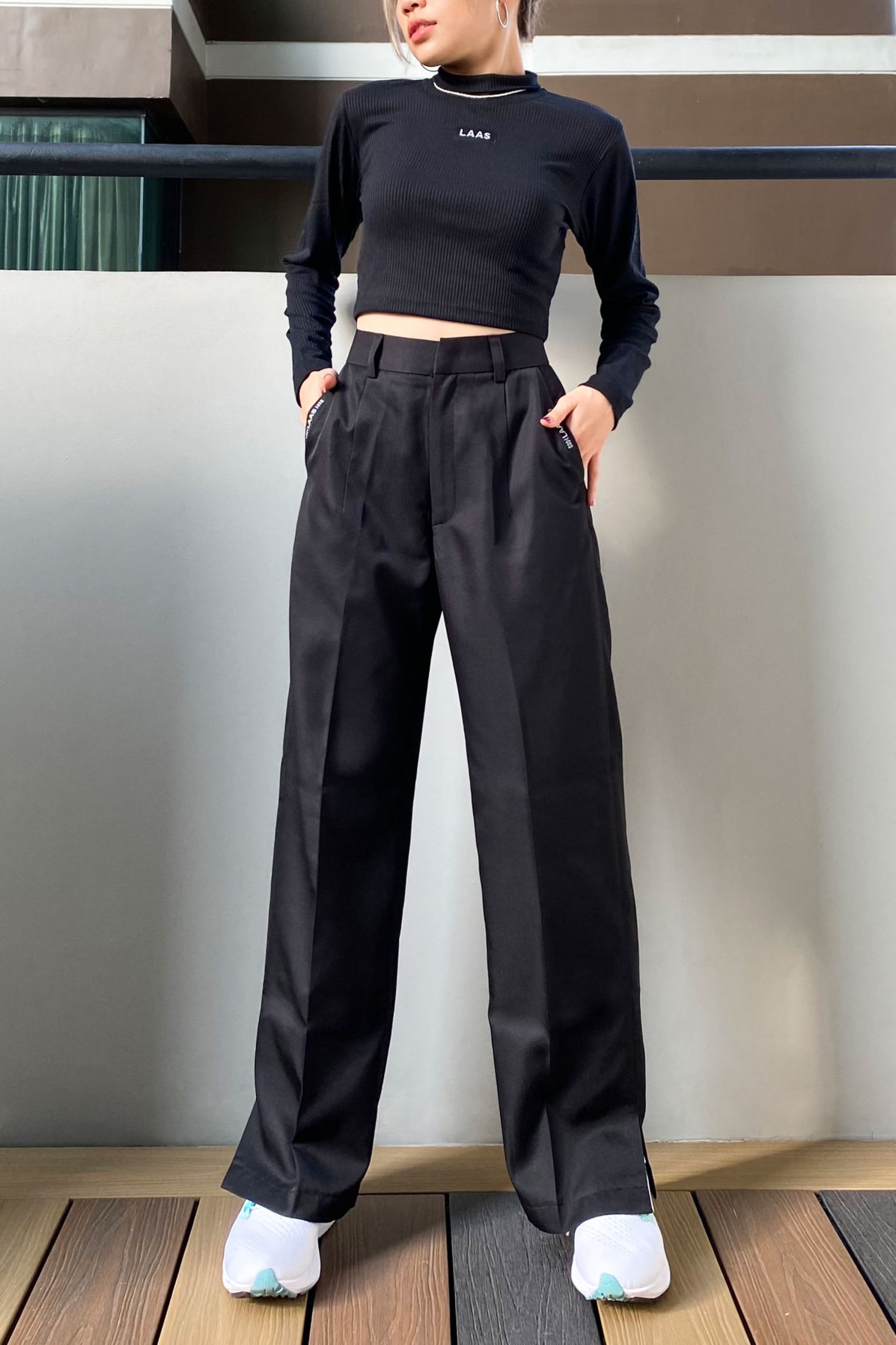 CHẤT LIỆU KAKI TÂY, DÀY DẶN ĐỨNG FORM QUẦN MÀU ĐEN FORM QUẦN ỐNG ĐỨNG, SUÔN THẲNG TẠO ĐÔI CHÂN DÀI PHẦN LAI QUẦN XẺ HAI BÊN TAG LOGO GẮN NGAY SƯỜN TÚI VÒNG EO