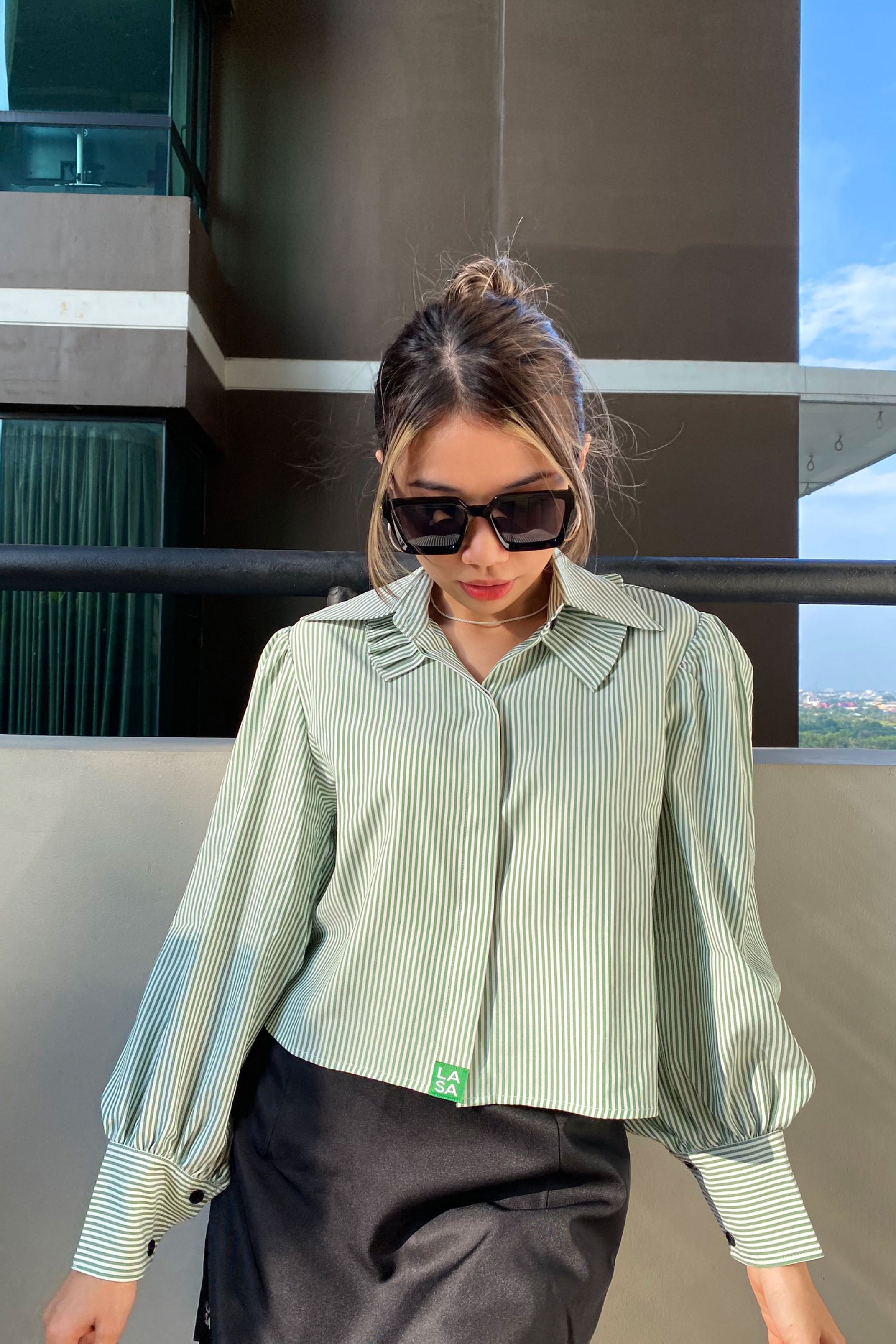CHẤT SOMI COTTON PHA, MỀM ĐỨNG PHOM ÁO MÀU XANH LÁ SỌC TRẮNG ÁO CỔ SOMI KIỂU, TAY PHỒNG, NẸP ÁO GIẤU NÚT PHOM ÁO CROPTOP ĐIỂM NHẤN PHẦN XẾP LY Ở LÁ CỔ PHẦN