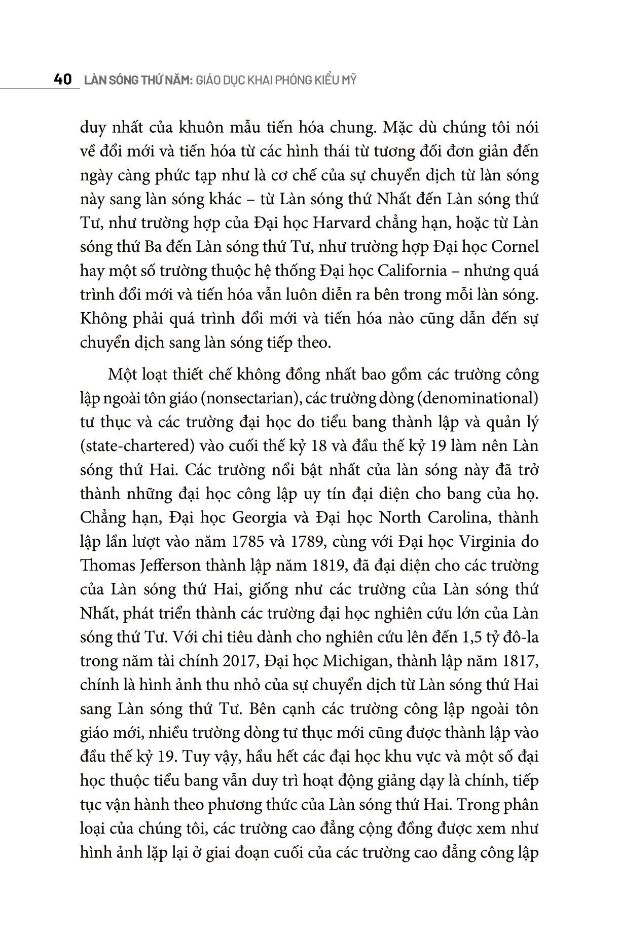 Làn Sóng Thứ Năm: Giáo Dục Khai Phóng Kiểu Mỹ Tái cấu trúc giáo dục đại học Hoa Kỳ Làn Sóng Thứ Năm: Giáo Dục Khai Phóng Kiểu Mỹ có thể được coi như một đề xuất tái cấu trúc giáo dục đại học Hoa Kỳ nói chung, dựa trên trường hợp thành công của Đại học Bang Arizona, và rộng hơn nữa là để tham khảo trong quá trình tái cấu trúc giáo dục đại học ở các nước trên thế giới, trong đó có Việt Nam, vốn đã có truyền thống hợp tác gần gũi, sâu rộng với ASU. Các tác giả của cuốn sách thực sự am hiểu sâu sắc về những gì nên và không nên làm trong giáo dục đại học: tận dụng mọi thế mạnh của sinh viên và hướng họ đến những vấn đề cấp bách nhất của thời đại. Trong The Fifth Wave: The Evolution of American Higher Education, Michael M. Crow và William B. Dabars lập luận rằng các trường cao đẳng và đại học cần được thiết kế lại toàn diện để có thể đào tạo càng nhiều sinh viên càng tốt và giữ nguyên chỉ tiêu tuyển sinh ngay cả khi thứ hạng của trường tăng lên (tức không tuyể sinh khắt khe hơn). Hai ông cho rằng chính sách tuyển sinh quá nghiêm ngặt của các trường như Harvard và Yale chỉ có nghĩa là họ đã chọn những sinh viên mà thành công sau này ít nhiều đã được bảo đảm, dù thế nào. Theo ông, việc đào tạo những sinh viên có khả năng và cơ hội thành công thấp hơn mới mang lại nhiều giá trị. Các nghiên cứu mới đây đã chứng minh ý kiến của ông là đúng. Làn Sóng Thứ Năm: Giáo Dục Khai Phóng Kiểu Mỹ - Làn sóng của tri thức và công nghệ Về mặt tên gọi, Crow và Dabars phân chia lịch sử giáo dục đại học Hoa Kỳ thành các làn sóng nối tiếp nhau từ các trường thời lập quốc (Làn sóng thứ Nhất) cho đến các trường đại học nghiên cứu (Làn sóng thứ Tư), và Làn sóng thứ Năm đang dần hình thành sẽ bao gồm một liên minh các trường cao đẳng và đại học có mong muốn mang lại tác động tích cực cho xã hội thông qua sự tích hợp liền mạch giữa sản xuất tri thức đẳng cấp thế giới và đổi mới công nghệ. Các trường thuộc Làn sóng thứ Năm như Đại học Bang Arizona đã bắt đầu mở rộng mạng lưới bao gồm học viện, doanh nghiệp, các cơ quan chính phủ, phòng thí nghiệm và các tổ chức xã hội dân sự. Tập hợp các thiết chế này ưu tiên tiếp cận nhóm nhân khẩu học rộng nhất có thể, đại diện cho các thành phần kinh tế xã hội và trí tuệ đa dạng trong xã hội. Ý tưởng về Làn sóng thứ Năm thực sự rất tuyệt vời. Với các dữ liệu phong phú và sự thật thú vị về các trường đại học, được đúc kết từ nhiều lĩnh vực khác nhau từ thiết kế, kinh tế, chính sách công, lý thuyết tổ chức, nghiên cứu khoa học và công nghệ, xã hội học, tâm lý học và thậm chí nhận thức luận, các tác giả đã trình bày một chủ đề quan trọng, đầy hứa hẹn và tôi tin rằng với bất kỳ ai quan tâm đến tương lai của giáo dục đại học đều không nên bỏ qua Làn sóng thứ Năm: Giáo Dục Khai Phóng Kiểu Mỹ.
