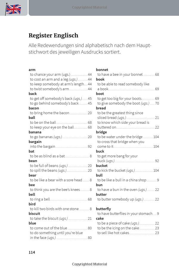 Jede Redewendung mit wörtlicher und idiomatischer Übersetzung sowie einem Anwendungsbeispiel