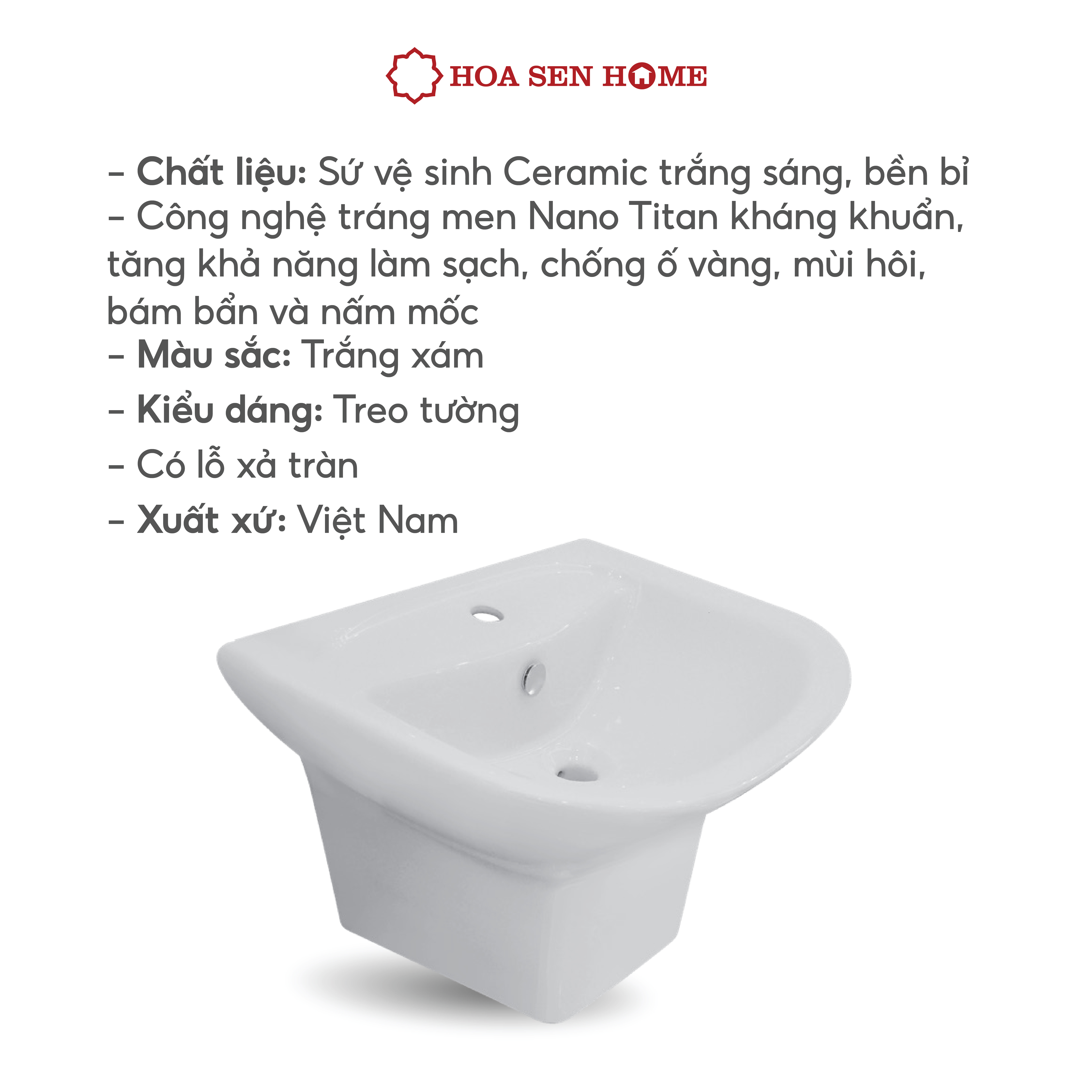 Chất liệu: Sứ vệ sinh Ceramic trắng sáng, bền bỉ
