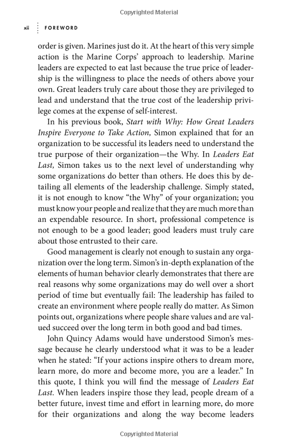 As in Start with Why, Sinek illustrates his ideas with fascinating true stories, from the military to manufacturing, from government to investment banking. He shows that leaders who are willing to eat last are rewarded with deeply loyal colleagues who will stop at nothing to advance their vision. It's amazing how well it works.