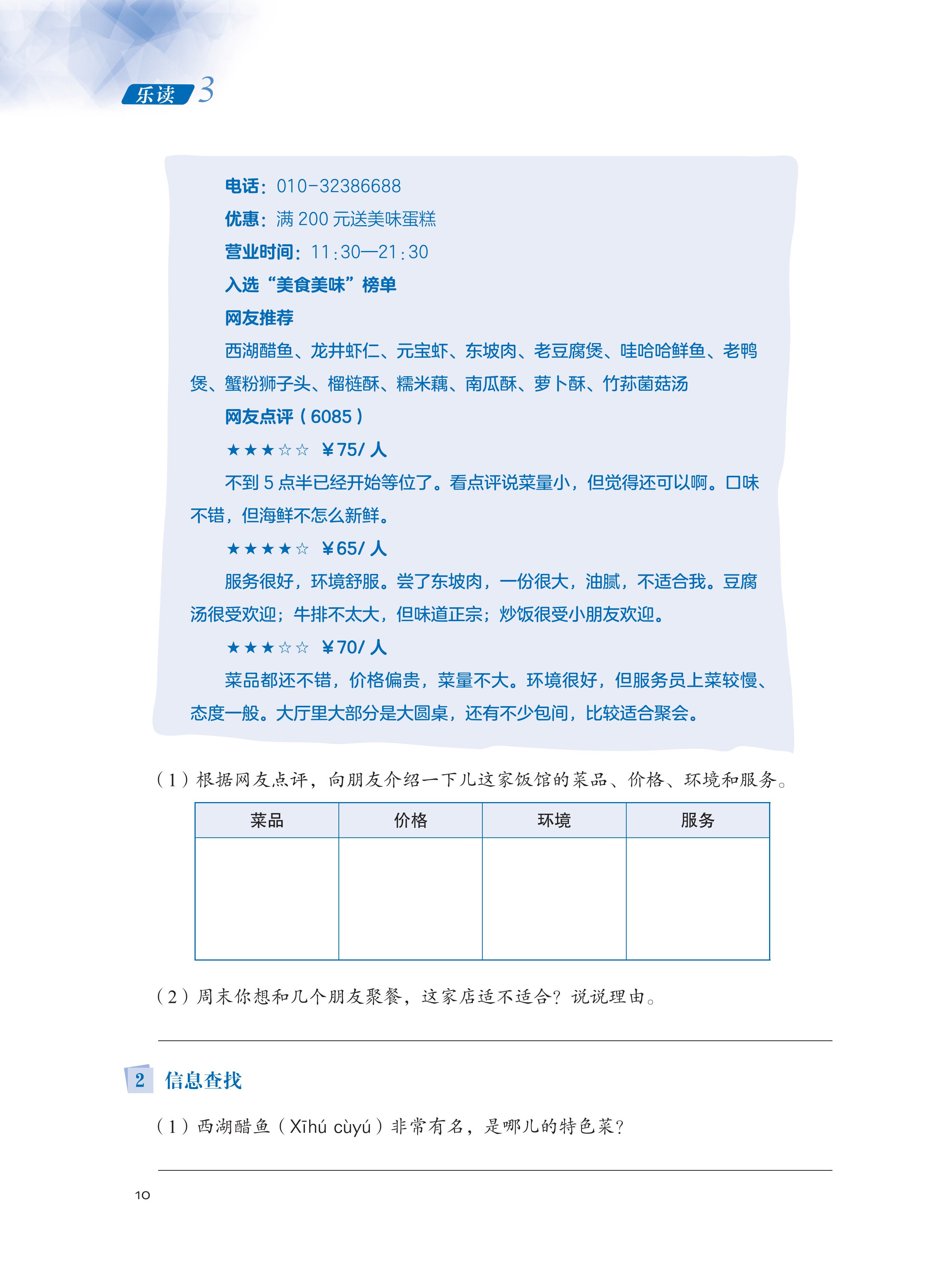Phần 3: Thực tiễn đọc hiểu. Bao gồm ba phần lớn là đọc chuyên sâu, đọc mở rộng và đọc thực tế. Phần “Đọc chuyên sâu” và “Đọc mở rộng” bao gồm các nội dung như: học tập các từ vựng trọng tâm và từ vựng mở rộng thuộc các chủ đề thường gặp, bài tập khởi động, bài tập lý giải nội dung bài khóa, lý giải nghĩa câu và lý giải nghĩa từ, v.v., đồng thời trên cơ sở này hướng dẫn người học nắm được ý chính của bài khóa, vận dụng từ vựng trọng tâm thuộc chủ đề bài khóa để trình bày quan điểm, giới thiệu nội dung có liên quan một cách ngắn gọn. Phần “Đọc thực tế” bao gồm hai loại: Loại thứ nhất - “Đọc văn thuyết minh”, giúp người học tích lũy thường thức về lịch sử, văn hóa cần có đồng thời được tiếp xúc rộng rãi trong học tập và sinh hoạt thường ngày; loại thứ hai - “Tra tìm thông tin”, như tra tìm các thông tin du lịch, bảng giờ tàu xe, bảng các triều đại lịch sử, v.v., việc thiết kế nhiệm vụ nhấn mạnh tính ứng dụng, mục đích nhằm giúp người học giải quyết các vấn đề thường gặp trong học tập và sinh hoạt thường ngày.