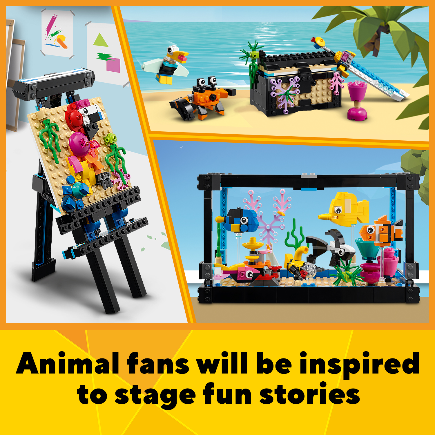 Trẻ em có thể tham gia vào các cuộc phiêu lưu dưới nước của riêng mình với đồ chơi có thể xây dựng LEGO Creator 31122 Bể cá thần kì (352 chi tiết). Bể không kính có 5 loài cá rực rỡ khác nhau: một con cá hề, một con cá màu xanh, một con cá tang màu vàng, một con cá hồng y và một con cá anthias, cũng như một tàu ngầm mini, một số san hô và một loài thực vật thủy sinh.