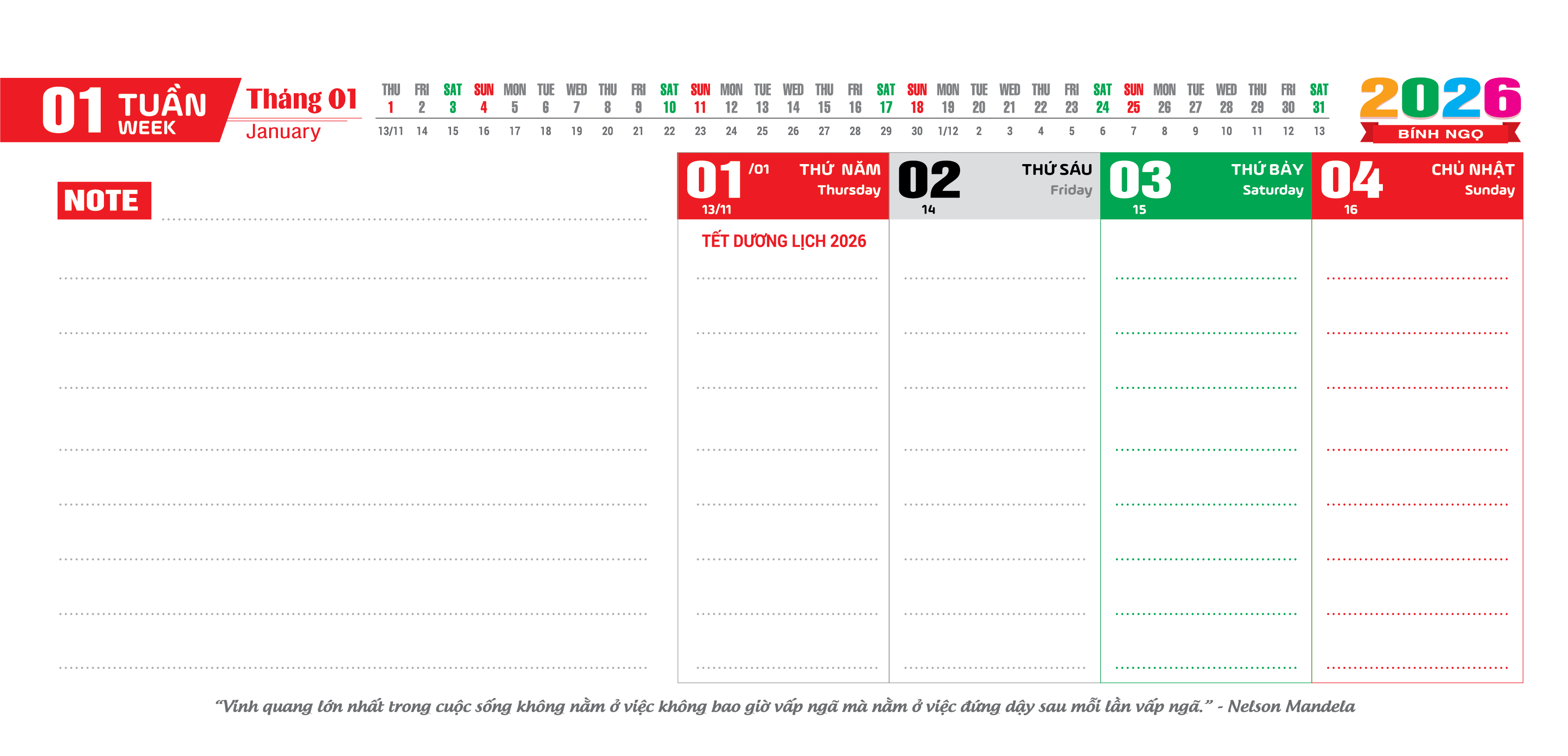 Lịch âm dương tháng 1 năm 2026 - Lịch vạn niên tháng 1/2026, Bính Ngọ