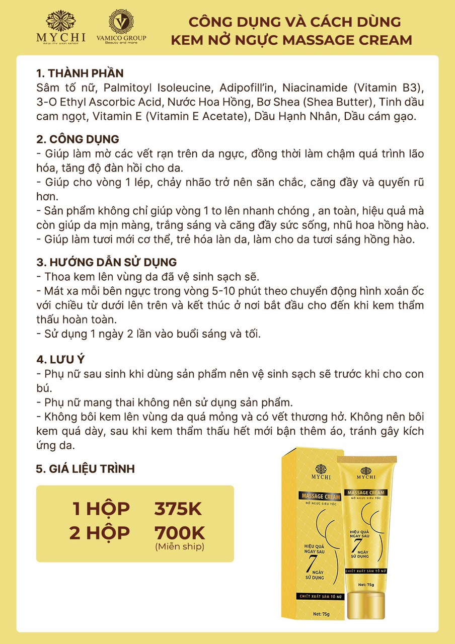 1. CÔNG DỤNG a. Kem nở ngực Mychi Massage cream - làm nở nguc, tăng kích thước vòng 1 tự nhiên, hồng nhu hoa, chống chảy xệ, xóa bỏ vết nứt, rạn sau khi sinh của
