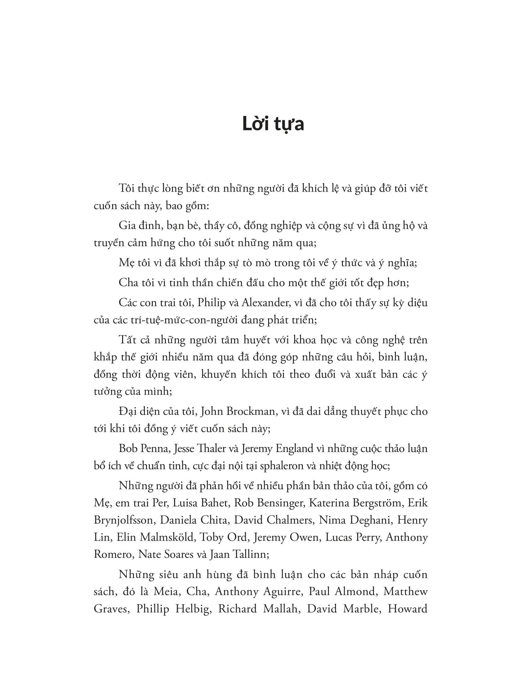 Tầm nhìn nhân văn: AI không phải là kẻ thù, mà là cơ hội (nếu ta hành động đúng đắn) Thay vì hù dọa người đọc về viễn cảnh tận thế bởi AI, Tegmark nhấn mạnh rằng: AI là công cụ. Cách nó ảnh hưởng tới nhân loại phụ thuộc vào cách chúng ta định hình nó. Từ đó, ông khơi gợi một thái độ chủ động, khích lệ người đọc tham gia vào cuộc đối thoại toàn cầu – về đạo đức, luật pháp, khoa học và cả triết học. NHẬN XÉT CỦA NHỮNG NGƯỜI CÓ TẦM ẢNH HƯỞNG Stephen Hawking – Nhà vật lý lý thuyết vĩ đại nhất thế kỷ 20: “Tất cả chúng ta – không chỉ các nhà khoa học, nhà tư bản công nghiệp hay nhà chiến lược – đều nên tự hỏi mình có thể làm gì để thu nhận tối đa ích lợi đồng thời tránh được các nguy cơ của AI trong tương lai. Đây là nội dung đối thoại quan trọng nhất của thời đại chúng ta, và cuốn sách đầy gợi mở này của Tegmark sẽ giúp bạn tham gia vào cuộc đối thoại đó.” Elon Musk – Nhà sáng lập SpaceX, CEO Tesla: “Đây là bản hướng dẫn đầy thuyết phục đưa chúng ta tới những thử thách và lựa chọn trong công cuộc tìm tới tương lai vĩ đại của cuộc sống, trí tuệ và ý thức – trên Trái Đất và còn xa hơn thế.” Nick Bostrom – Tác giả “Superintelligence”, Giám đốc Viện Tương lai Nhân loại (Oxford University): “Tegmark hướng tới những trao đổi rộng hơn nhiều về những kiểu tương lai mà chúng ta, với tư cách một giống loài, muốn tạo nên. Mặc dù các chủ đề nghe có vẻ khó nhằn – AI, vũ trụ học, các giá trị, hay thậm chí bản chất của trải nghiệm ý thức – nhưng cách dẫn dắt không hề đao to búa lớn của Tegmark khiến bất kỳ người đọc nào cũng có được những ý tưởng của riêng mình.” Lex Fridman – Nhà nghiên cứu AI, Host podcast nổi tiếng: “Max Tegmark là một trong những bộ óc có tầm nhìn xa nhất mà tôi từng gặp. Life 3.0 không chỉ cho bạn biết điều gì có thể xảy ra với AI, mà còn buộc bạn phải tự hỏi: bạn muốn điều gì xảy ra?”