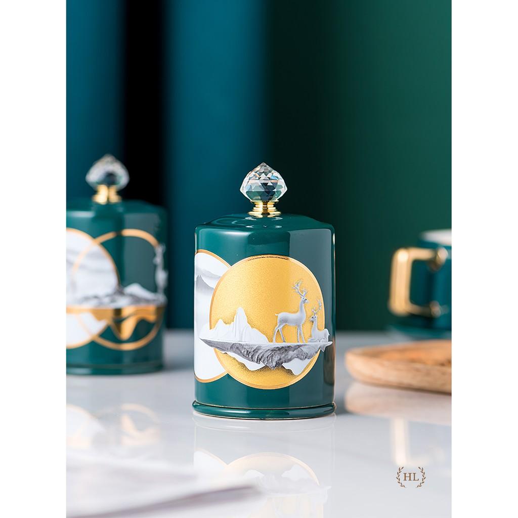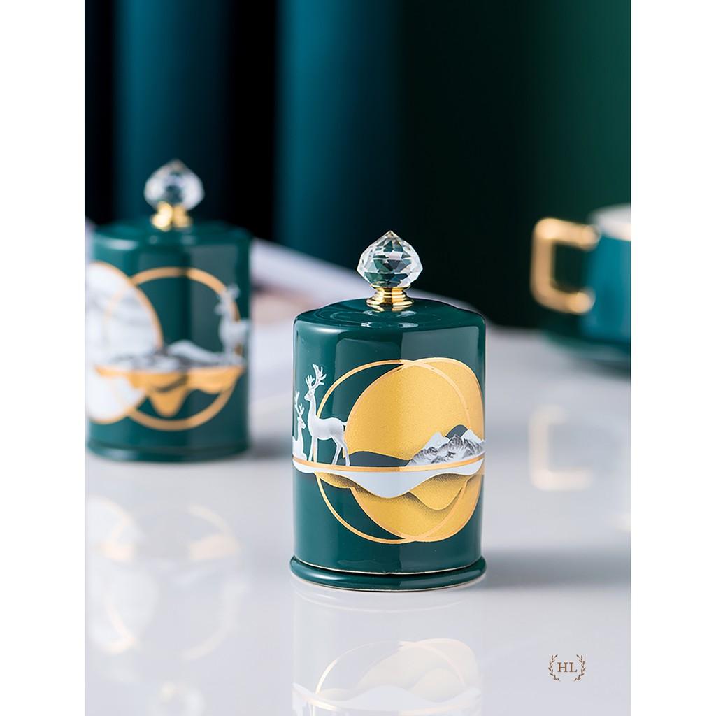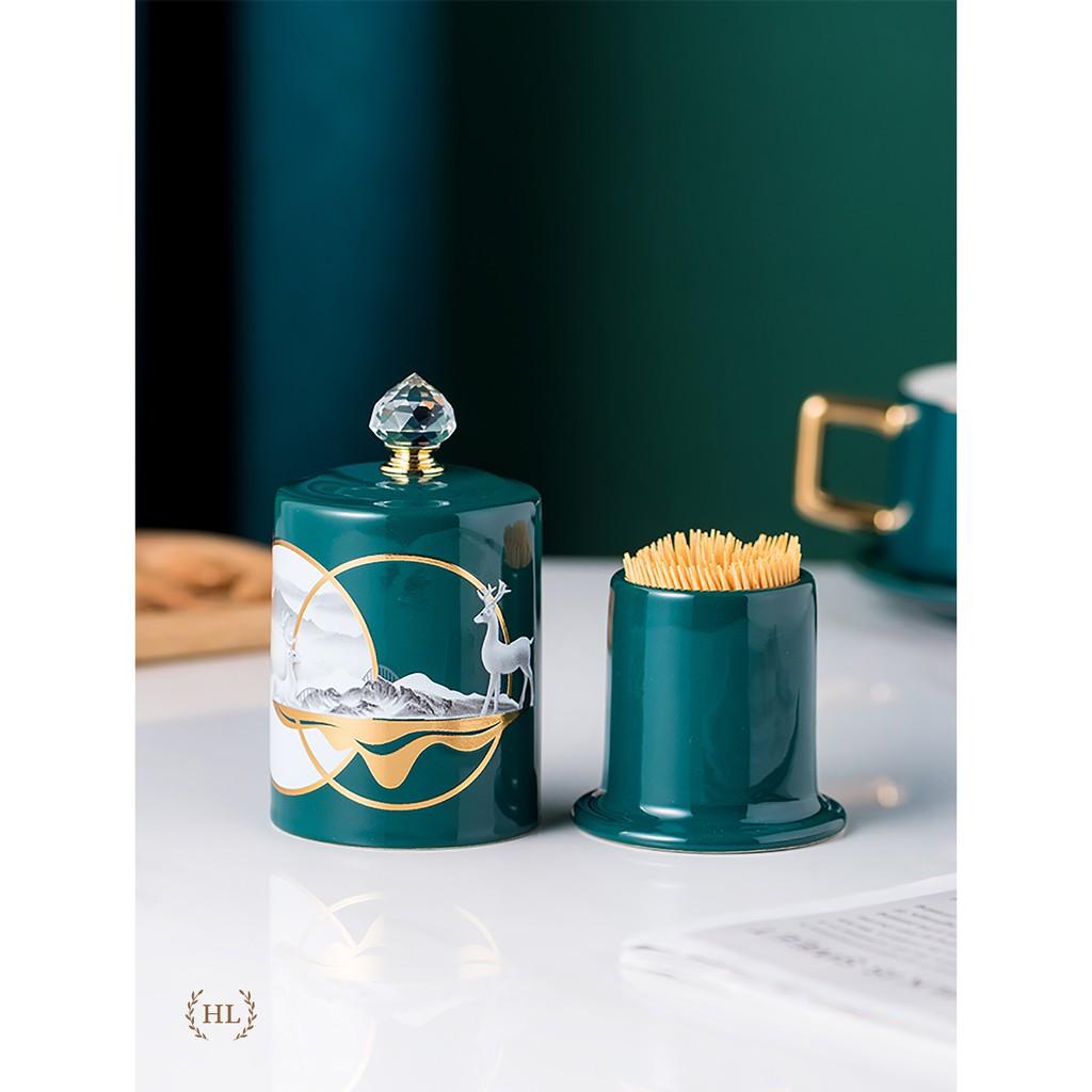 ✨Lọ Đựng Tăm Xanh Sứ Hoa Văn Hươu Cao Cấp Vàng Kim 2022 | Hũ sứ có nắp đậy đính đá size To