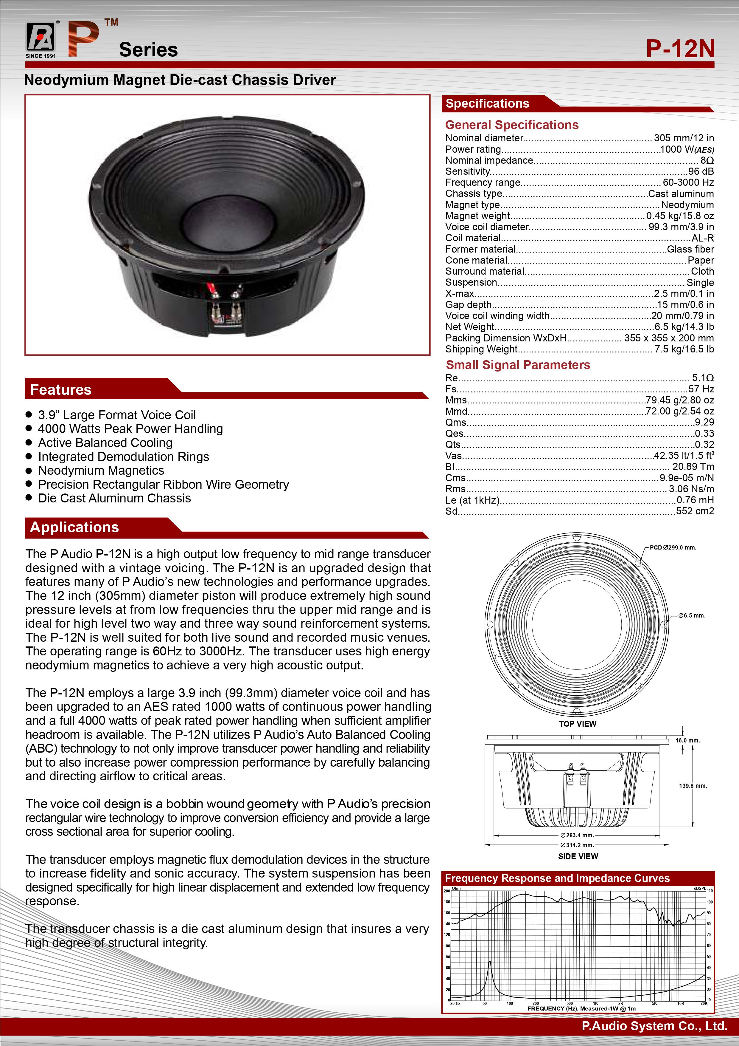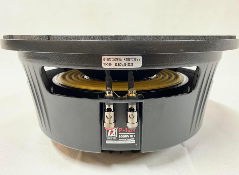Củ loa Bass P Audio Thái Land P-12Nlà dòng sản phẩm cao cấp của P.Audio có côngsuất lên tới 1000w Continues Power và Peak power lên tới 4000w. Dòng loa P12N có dải tần hoạt động từ 60Hz~3000Hz chất âm bass sâu và ấm áp hơn các dòng loa full khác như SN15-500B. dòng loa rất phù hợp làm sub 3 tấc hoặc loa full 3 tấc cho sự kiện, Event bởi trọng lượng của loa nhẹ dễ dàng di chuyển chất âm mềm phù hợp cho các chương trình ca nhạc Công suất: 1000W Độ nhạy: 96db Voil coil 99.3 mm