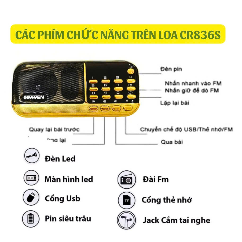 Loa thẻ nhớ Craven CR 836S - 2 Pin - Thẻ Nhớ, USB,FM Radio - Có Đèn Pin | shopthuan - 0906 756 502
