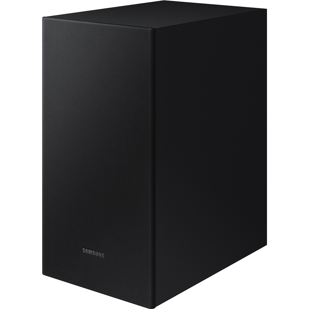Thiết kế dạng hình khối, đường nét tinh tế sang trọng Loa thanh Soundbar Samsung 2.1 HW-T420 sở hữu thiết kế dạng hình khối màu đen, các cạnh góc vuông tinh tế hiện đại, đem