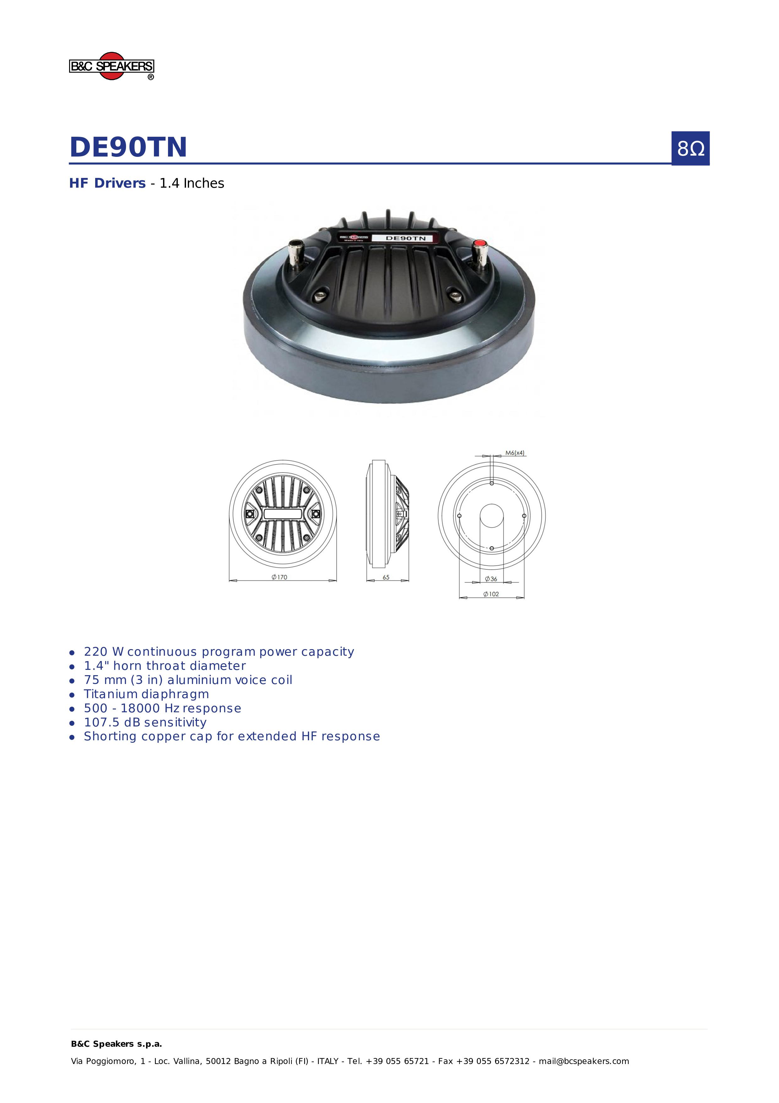 Loa Treble B&C SPEAKERS DE90TN Thương hiệu: B&C Xuất xứ: ITALIA Sử dụng họng 1.4" (ME90) Voice coil aluminium 75mm (3") Công Suất Program 220 W Độ nhạy: 107,5 db Dải tần: 500
