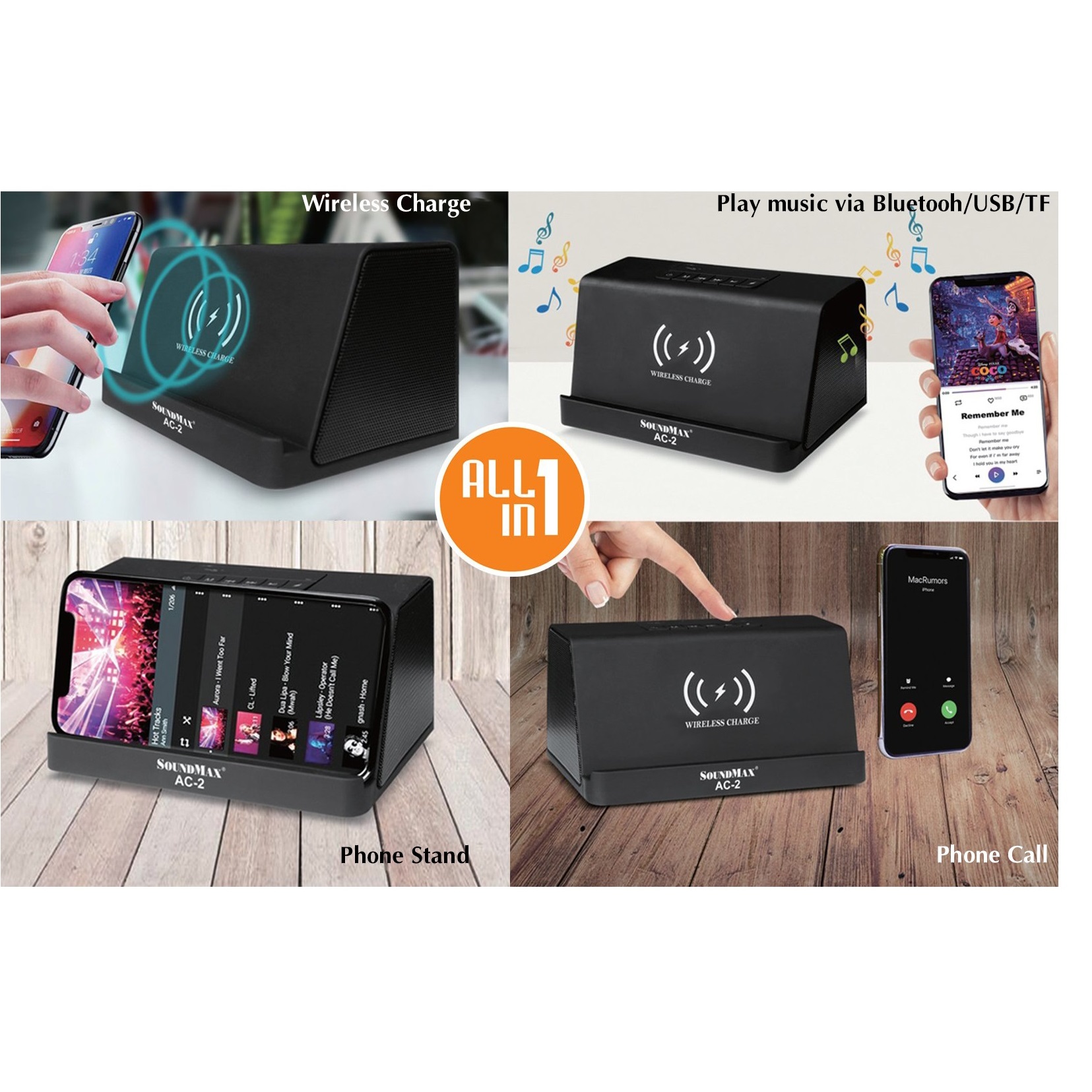 Loa Vi Tính SoundMax AC-2 10W (RMS) - Hàng Chính Hãng. *Loa bluetooth kiêm đế sạc không dây cho điện thoại, hỗ trợ chơi nhạc qua thẻ nhớ TF, USB - Tổng công suất: 10W