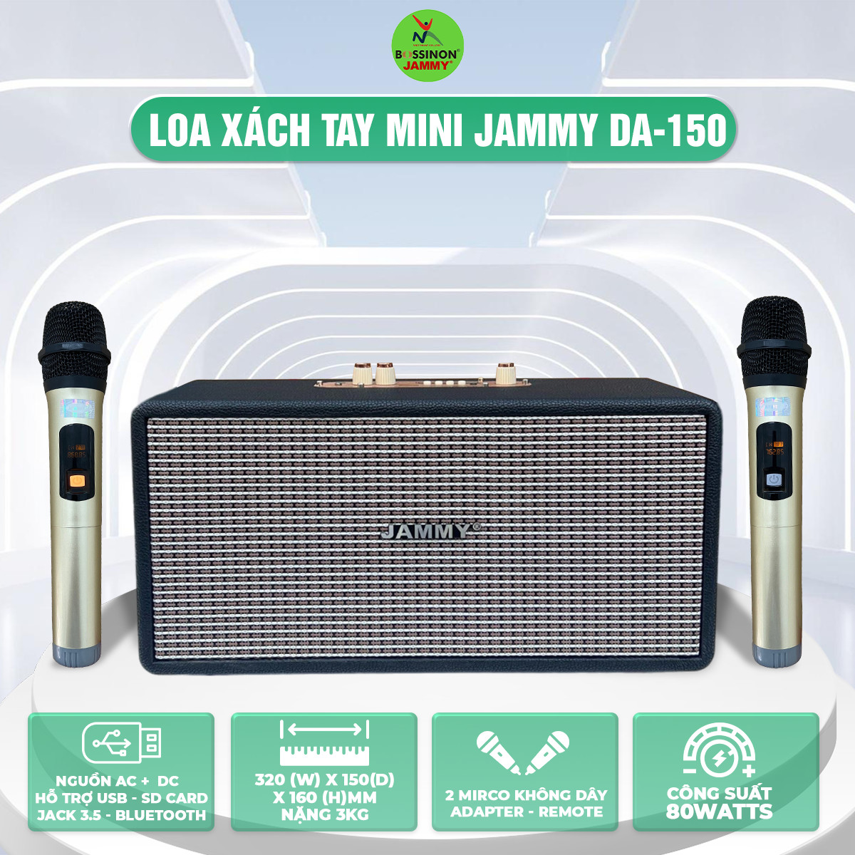 _Nguồn AC + DC _Hỗ trợ USB SD CARD Bluetooth Jack 3.5 _Phụ kiện 2 mic cầm tay không dây, adapter. remote _Công suất: 80Watts