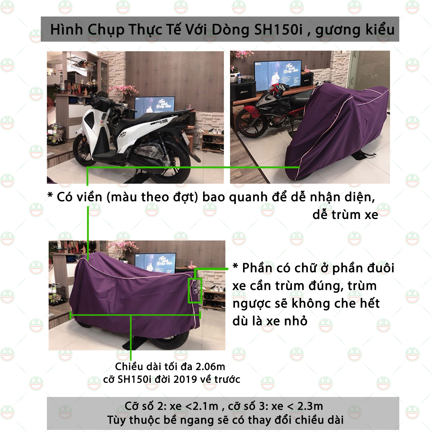 • Cỡ Số 2 - Dành cho xe số, tay ga thông dụng <2.10m như : SH Mode, Vespa, SH125i, SH150i đời cũ trước 2019 (bản mới từ 2020 trở đi phải chọn cỡ 3, tốt nhất chọn cỡ 3), Vario, AirBale đối với dòng SH lớn như SH125i, Sh150i, bạt sẽ hơi kích vì được thiết kế sát theo khung sườn SH lớn (kiểu mặc áo body) , các xe nhỏ hơn sẽ rộng rãi thoải mái (như mặc áo khoác)