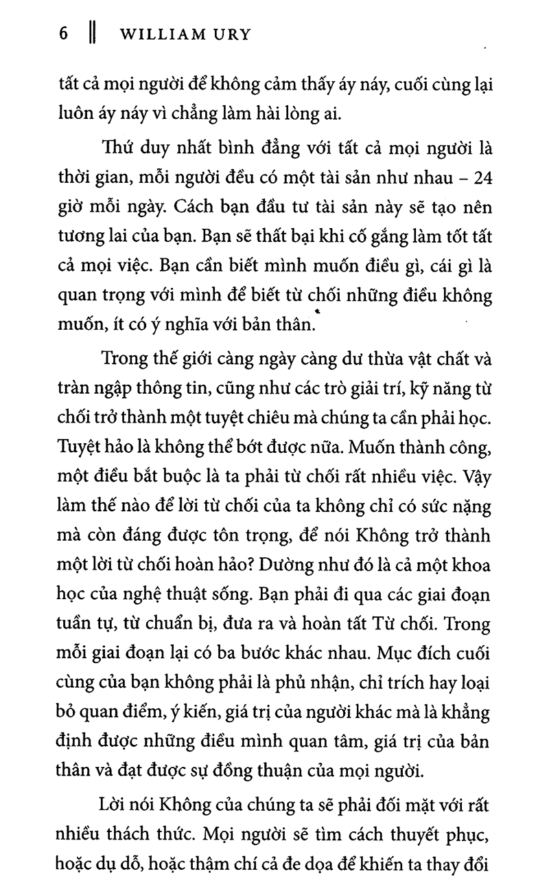 Dường như đó là cả một khoa học của nghệ thuật sống. Bạn phải đi qua các giai đoạn tuần tự, từ chuẩn bị, đưa ra và hoàn tất Từ chối. Trong mỗi giai đoạn lại có ba bước khác nhau. Mục đích cuối cùng của bạn không phải là phủ nhận, chỉ trích hay loại bỏ quan điểm, ý kiến, giá trị của người khác mà là khẳng định được những điều mình quan tâm, giá trị của bản thân và đạt được sự đồng thuận của mọi người .