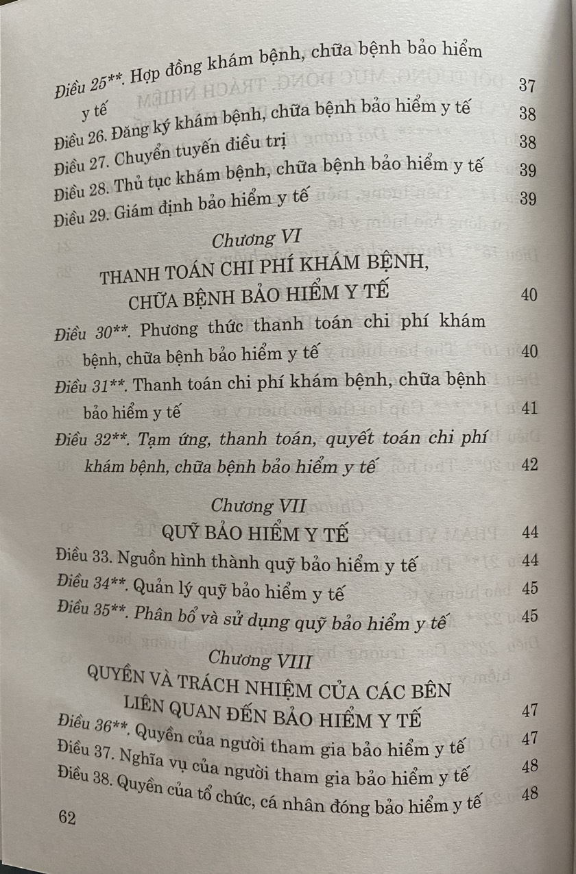 Luật Bảo hiểm y tế năm 2008 đã được Quốc hội nước Cộng hòa xã hội chủ nghĩa Việt Nam khóa XII, kỳ họp thứ 4 thông qua ngày 14/11/2008, quy định về chế độ, chính sách bảo hiểm y tế, bao gồm đối tượng, mức đóng, trách nhiệm và phương thức đóng bảo hiểm y tế; thẻ bảo hiểm y tế; phạm vi được hưởng bảo hiểm y tế; tổ chức khám bệnh, chữa bệnh cho người tham gia bảo hiểm y tế; thanh toán chi phí khám bệnh, chữa bệnh bảo hiểm y tế; quỹ bảo hiểm y tế; quyền và trách nhiệm của các bên liên quan đến bảo hiểm y tế.