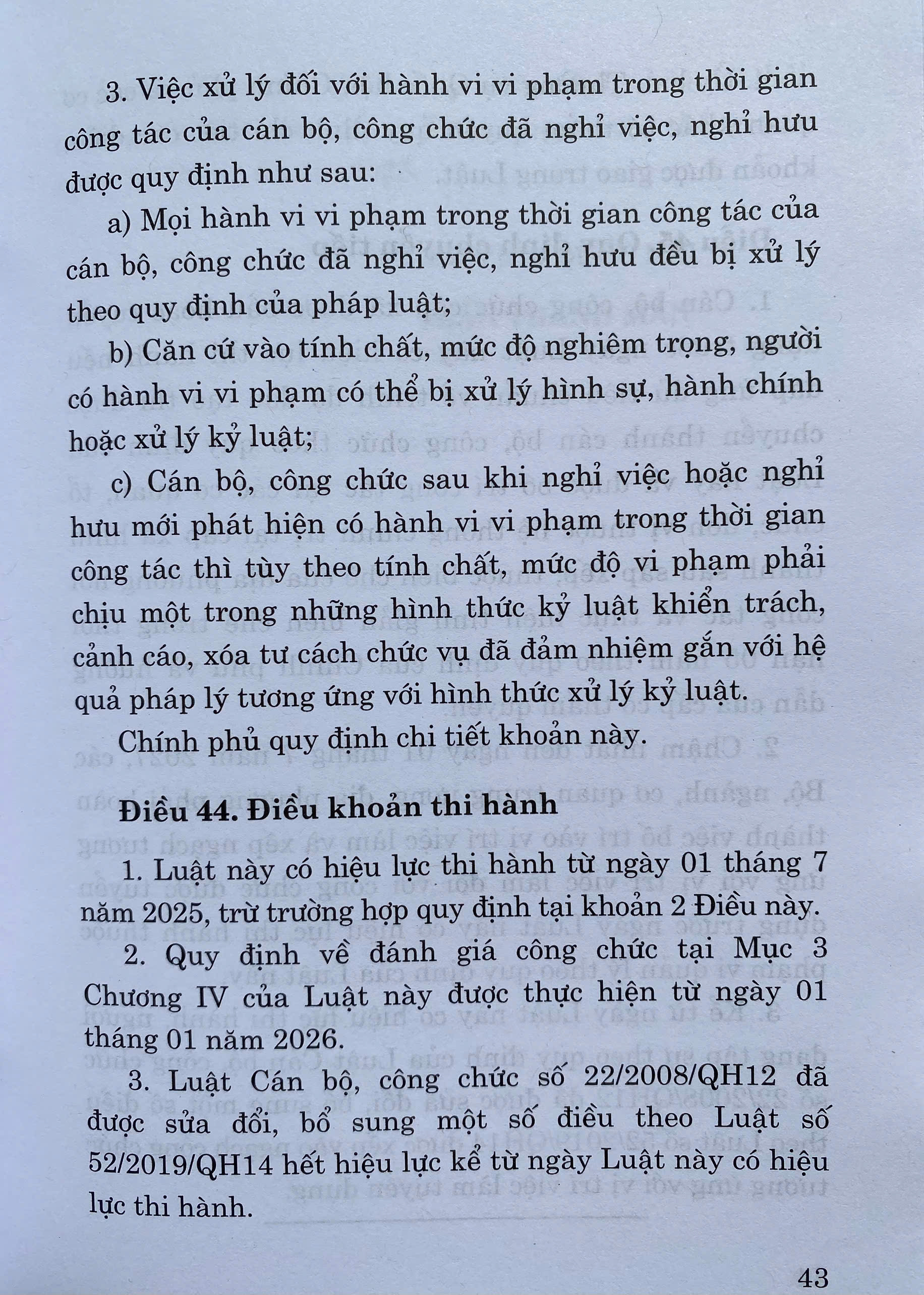 Luật Cán Bộ, Công Chức số 80/2025/QH15 đã được Quốc Hội khoá XV, kỳ họp thứ 9 thông qua ngày 24-06-2025 . Luật gồm có 7 Chương, 45 Điều. Luật có hiệu lực áp dụng từ ngày 01-07-2025.