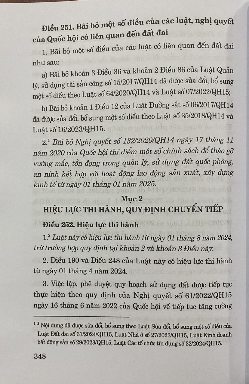 Ngày 13 tháng 01 năm 2024 , tại Kỳ họp bất thường lần thứ 5, Quốc hội nước Cộng hòa xã hội chủ nghĩa Việt Nam khóa XV đã thông qua Luật Đất đai số 31/2024/QH15 và có hiệu lực thi hành từ ngày 01 tháng 01 năm 2025. Tuy nhiên, với ý nghĩa và tầm quan trọng đặc biệt của Luật Đất đai trong đời sống kinh tế - xã hội, quốc phòng, an ninh, có tác động sâu rộng đến người dân, doanh nghiệp và có mối quan hệ chặt chẽ với nhiều luật khác có liên quan. Do đó, ngày 29 tháng 6 năm 2024 tại Kỳ họp thứ 7, Quốc hội nước Cộng hòa xã hội chủ nghĩa Việt Nam khóa XV đã thông qua Luật Sửa đổi, bổ sung một số điều của Luật Đất đai số 31/2024/QH15, Luật Nhà ở số 27/2023/QH15, Luât Kinh doanh bất động sản số 29/2023/QH15, Luật Các tổ chức tín dụng số 32/2024/QH15 (Luật số 43/2024/QH15). Theo đó, Luật Đất đai số 31/2024/QH15 sẽ có hiệu lực thi hành từ ngày 01/8/2024