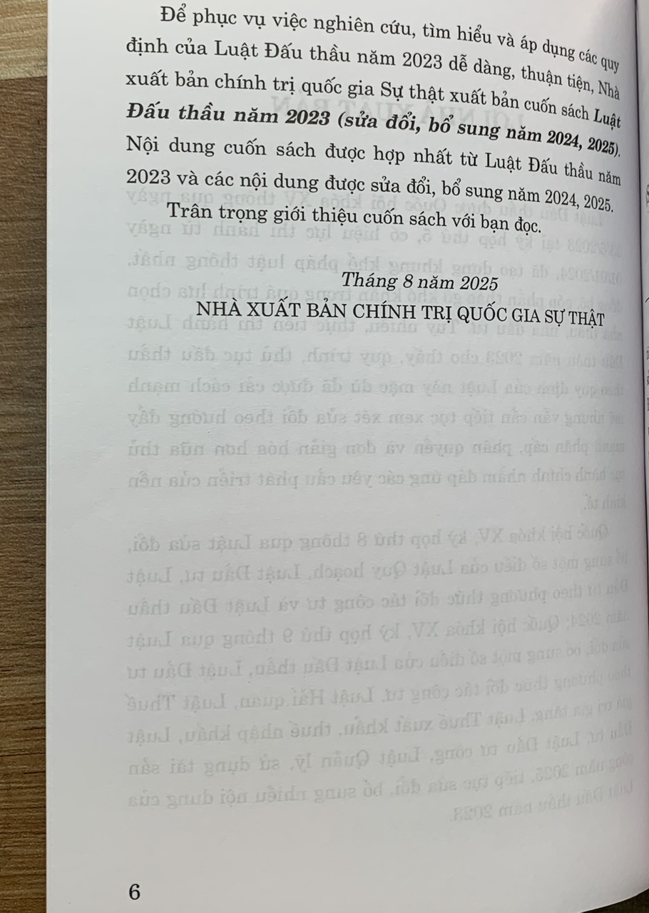 Để phục vụ việc nghiên cứu, tìm hiểu và áp dụng các quy định của Luật Đấu thầu năm 2023 dễ dàng, thuận tiện, Nhà xuất bản Chính trị quốc gia Sự thật xuất bản cuốn sách Luật Đấu thầu năm 2023 (sửa đổi, bổ sung năm 2024, 2025). Nội dung cuốn sách được hợp nhất từ Luật Đấu thầu năm 2023 và các nội dung được sửa đổi, bổ sung năm 2024, 2025.