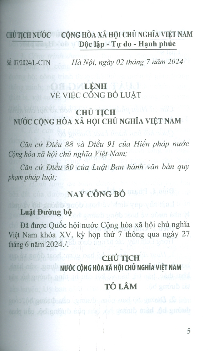 Ngày 27/6/2024, tại kỳ họp thứ 7, Quốc hội khóa XV đã thông qua Luật Trật tự, an toàn giao thông đường bộ thay thế Luật Giao thông đường bộ năm 2008 (sửa đổi, bổ