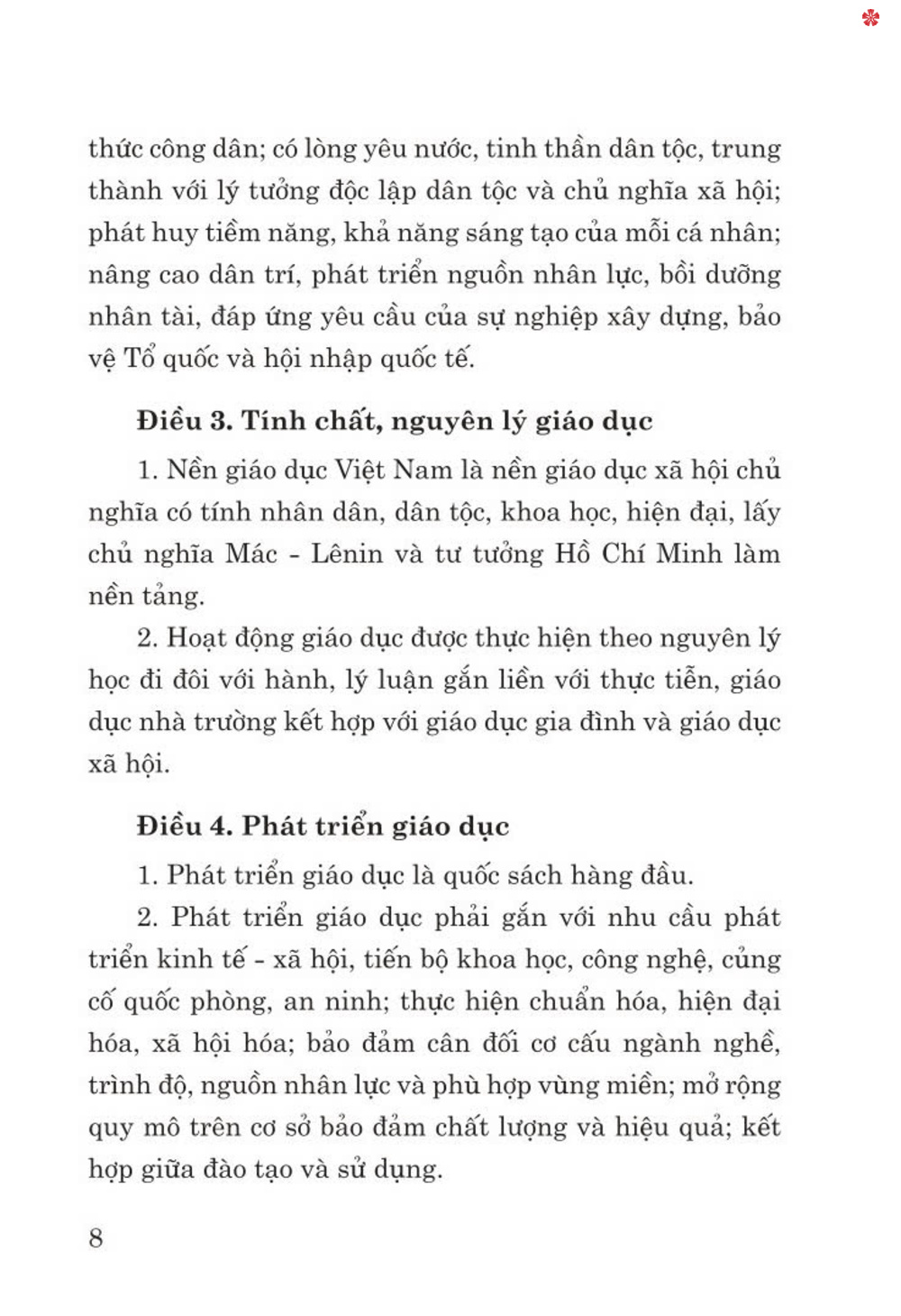 Mua tại TiktokLuật Giáo dục được Quốc hội nước Cộng hòa xã hội chủ nghĩa Việt Nam khóa XIV, kỳ họp thứ 7 thông qua ngày 14/6/2019, có hiệu lực từ ngày 01/7/2020. Luật gồm 9 chương, 115 điều, quy định về hệ thống giáo dục quốc dân; tổ chức, hoạt động, nhiệm vụ, quyền hạn của các cơ sở giáo dục; nhiệm vụ, quyền hạn, tiêu chuẩn, chính sách đối với nhà giáo, người học; quản lý nhà nước về giáo dục; trách nhiệm của cơ quan, tổ chức, cá nhân liên quan đến hoạt động giáo dục; đầu tư và tài chính trong giáo dục.