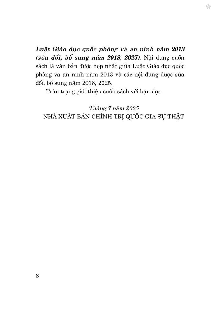 Luật Giáo dục quốc phòng và an ninh năm 2013 (sửa đổi, bổ sung năm 2018, 2025) do Nhà xuất bản Chính trị quốc gia Sự thật phát hành là tài liệu pháp lý quan