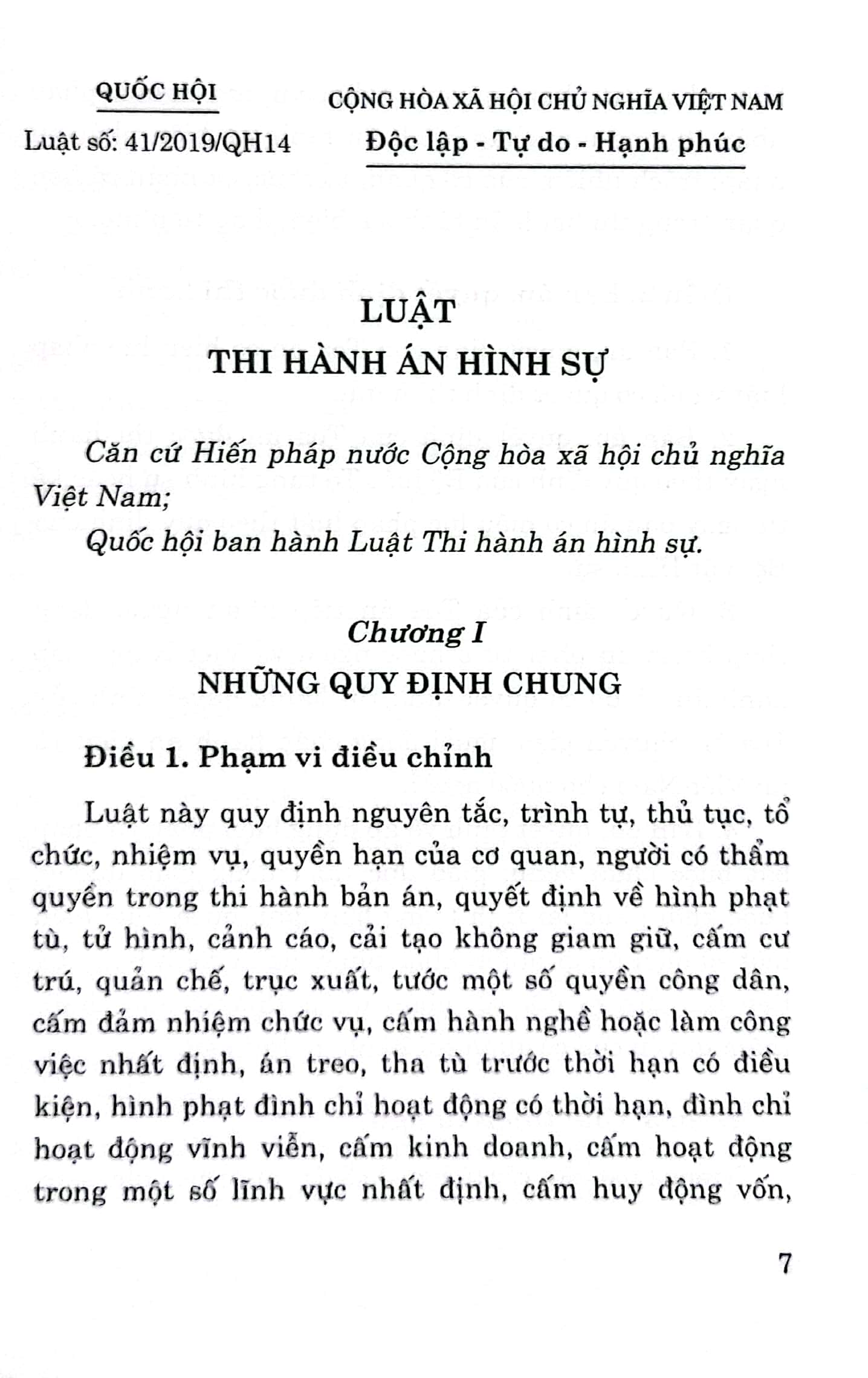 Luật Thi hành án hình sự được Quốc hội nước Cộng hòa xã hội chủ nghĩa Việt Nam khóa XIV, kỳ họp thứ 7 thông qua ngày 14/6/2019, có hiệu lực thi hành 01/01/2020. Luật