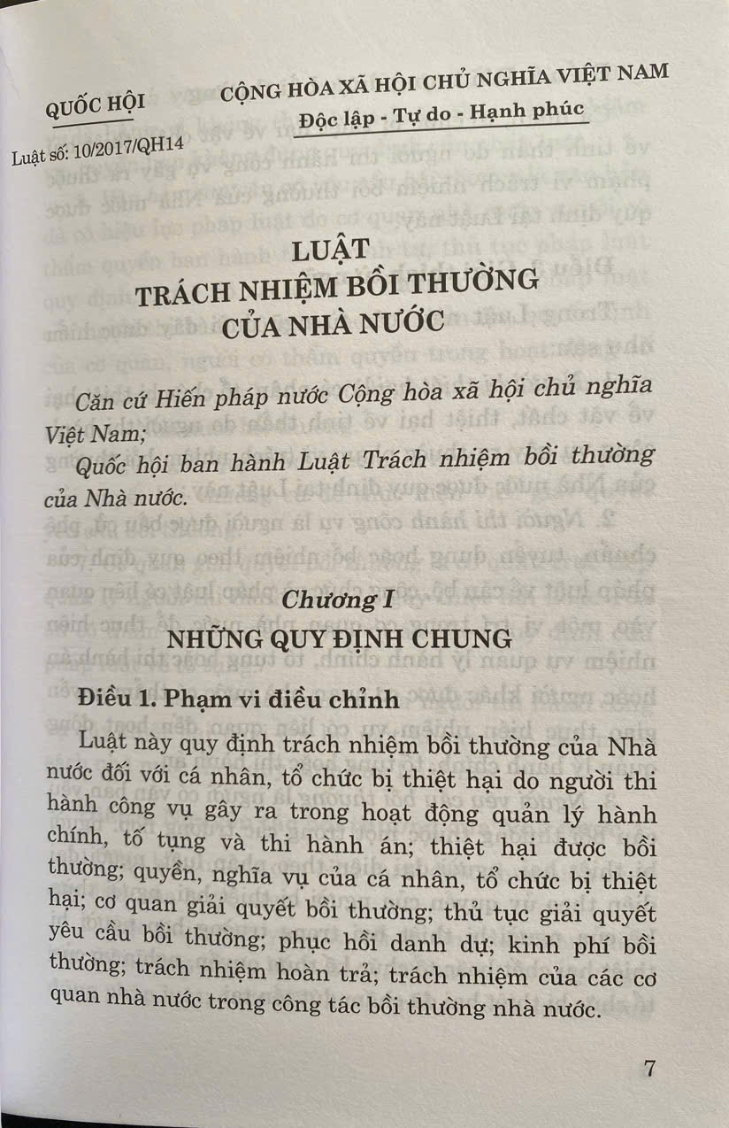 Luật Trách Nhiệm Bồi Thường Của Nhà Nước số 10/2017/QH14 đã được Quốc Hội khoá XIV thông qua ngày 20-06-2017. Luật gồm có 9 chương, 78 điều ( Luật có hiệu luật thi hành từ ngày 01 -07 -2018 )