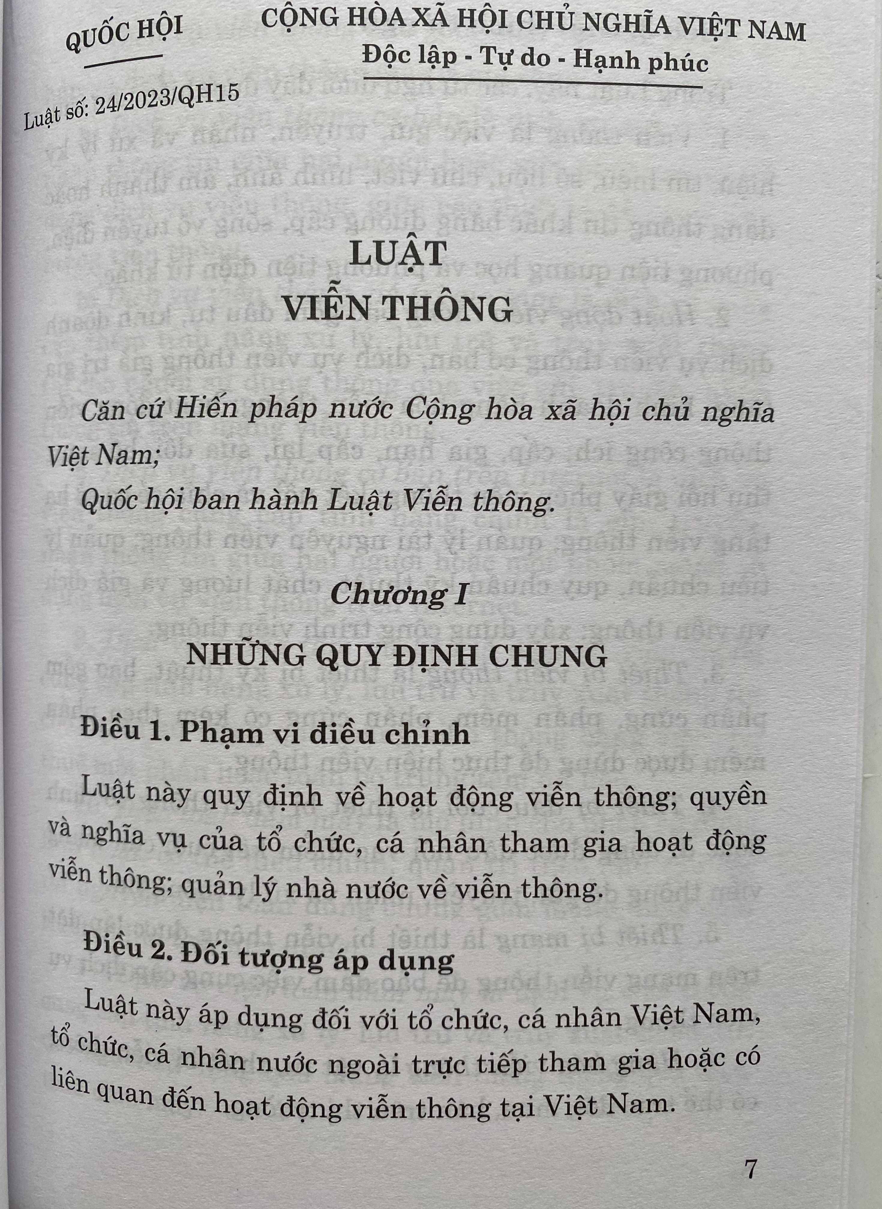 Luật Viễn Thông số 24/2023/QH15 đã được Quốc Hội khoá XV thông qua ngày 24-11-2023. Luật gồm có 10 chương, 73 điều . Luật có hiệu lực áp dụng từ ngày 01-07-2024