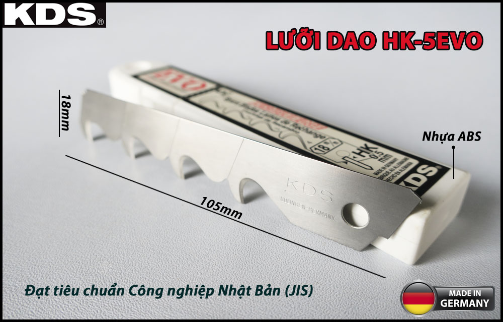 LƯỠI DAO CẮT DÂY KDS HK-5EVO THÔNG SỐ KỸ THUẬT : - Chất liệu: Thép SK2 - Kích thước: 105mm x 18mm x 0.6mm - Trọng lượng: 60g - Kích thước đóng gói: 13cm