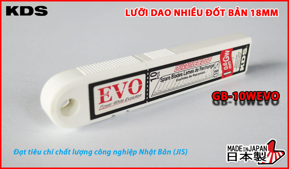 - Lưỡi dao nhiều đốt 18mm KDS GB-10WEVO là loại lưỡi dao rọc giấy có màu trắng và được chia thành 15 đốt, thiết kế này thiên về độ bền. Nếu bạn cần loại lưỡi dao thiên về độ sắc bén, bạn nên tham khảo thêm dòng lưỡi dao màu đen GB-10BEVO. Đây là loại lưỡi dao được chia thành 8 đốt, có cấu tạo, chức năng và cách sử dụng tương tự như lưỡi dao GB-10WEVO. LƯU Ý KHI SỬ DỤNG LƯỠI DAO KDS:
