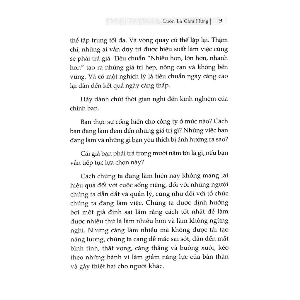 Hàng loạt các nhà lãnh đạo cấp cao của Google, S, Ford, Ernst & Young… đã tạo ra sự khác biệt, đạt thành công vượt bậc, giúp tổ chức của họ ngày lớn mạnh nhờ phương thức làm việc thông minh của Tony Schwartz qua cuốn “Luôn là cảm hứng” đồng tác giả của cuốn sách bán chạy nhất trên New York Times “The Power of Full Engagement” (Sức mạnh của sự tập trung cao độ).p>Gooda tin rằng cuốn sách sẽ mang lại kiến thức thật bổ ích cùng những trải nghiệm thật tuyệt vời, hy vọng đây sẽ là 1 cuốn sách quý trên kệ sách của bạn!