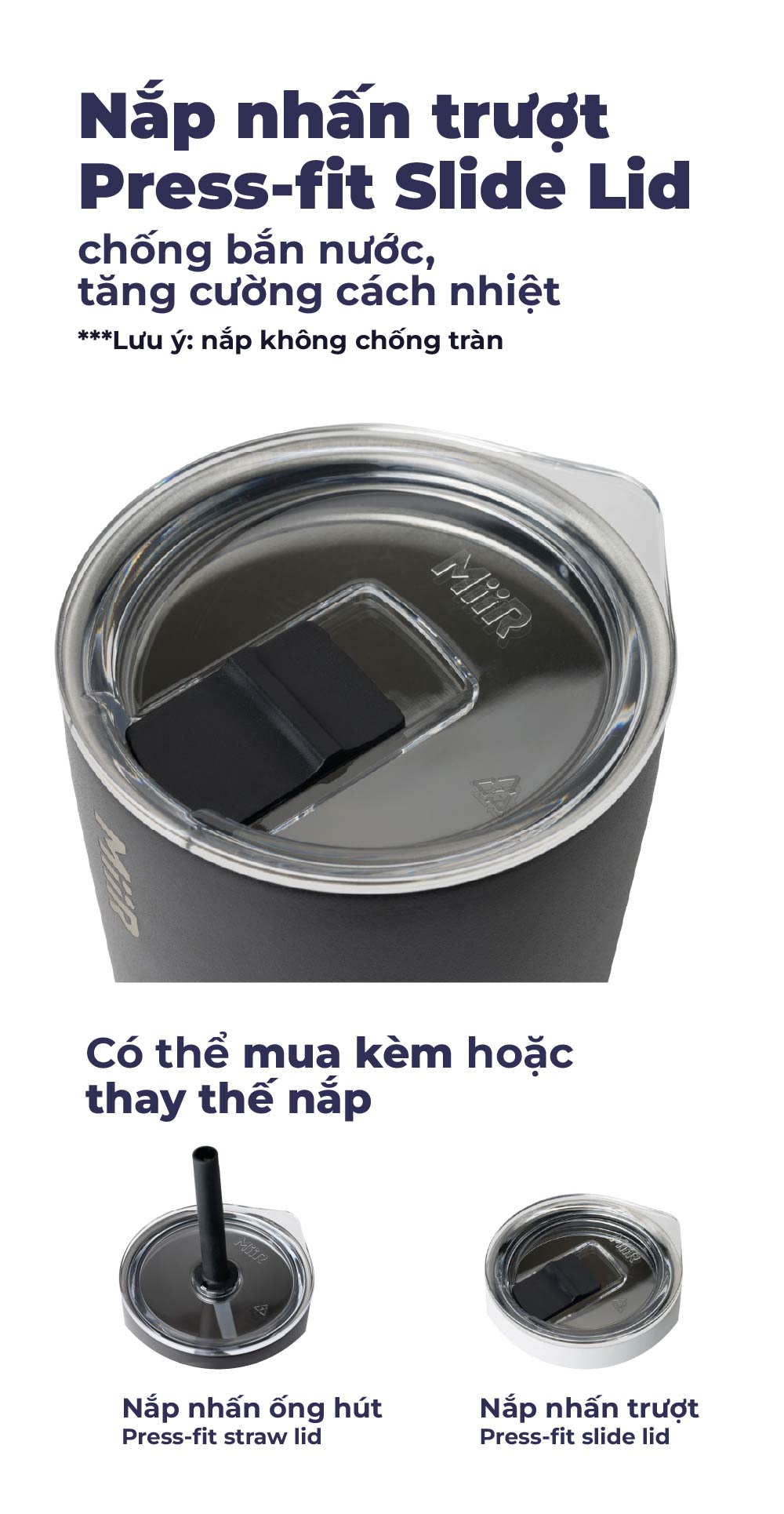 Đi kèm với ly là nắp trượt Press-fit che kín miệng ly, tăng cường khả năng cách nhiệt và giữ trọn hương vị đồ uống. Nắp được làm từ chất liệu nhựa cao cấp nên có khả năng chống vỡ tốt, tuổi thọ cao.
