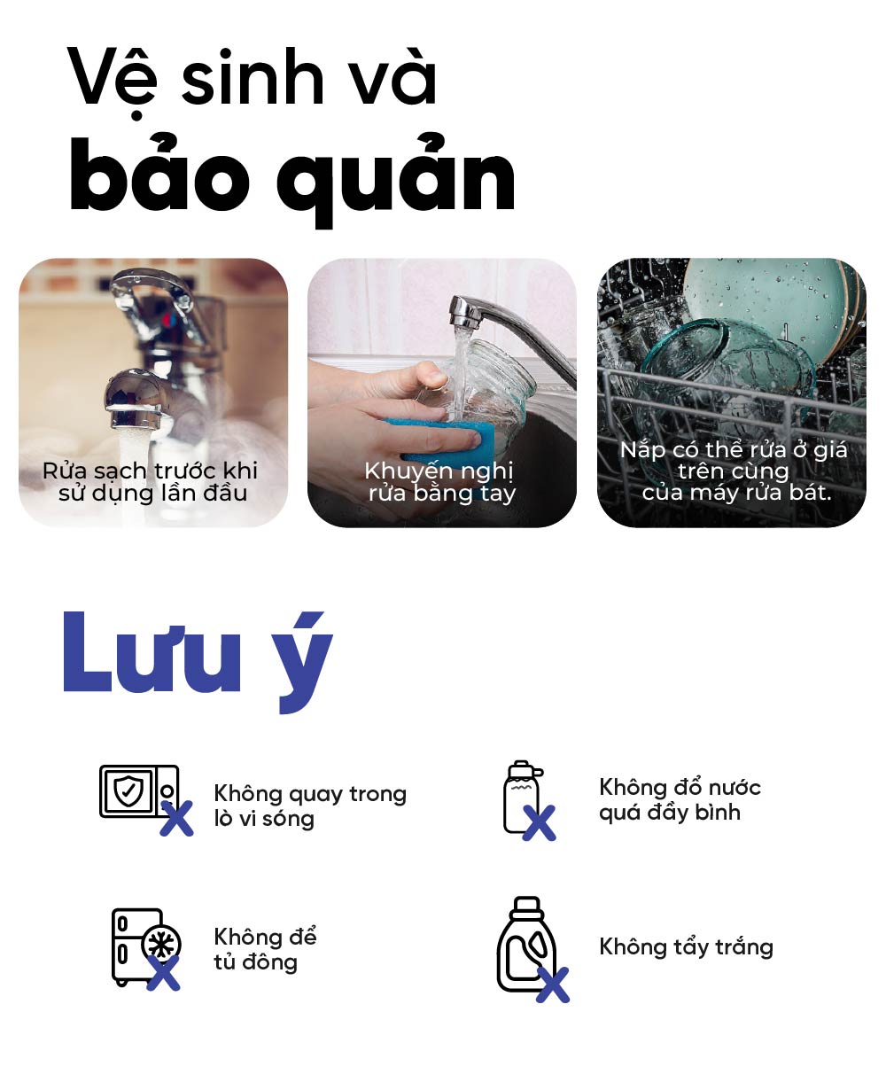 Không nên đặt ly vào lò vi sóng, tủ đông lạnh vì có thể gây hỏng sản phẩm.