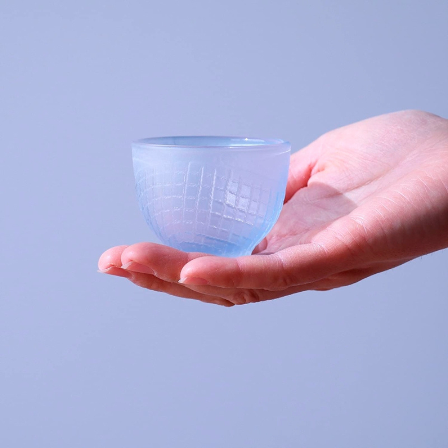 Ly Sake khoác trên mình một mành xanh lam nhạt, bên ngoài ly được phủ mờ, nổi bật với các họa tiết dập khuôn ô vuông trên thân ly.