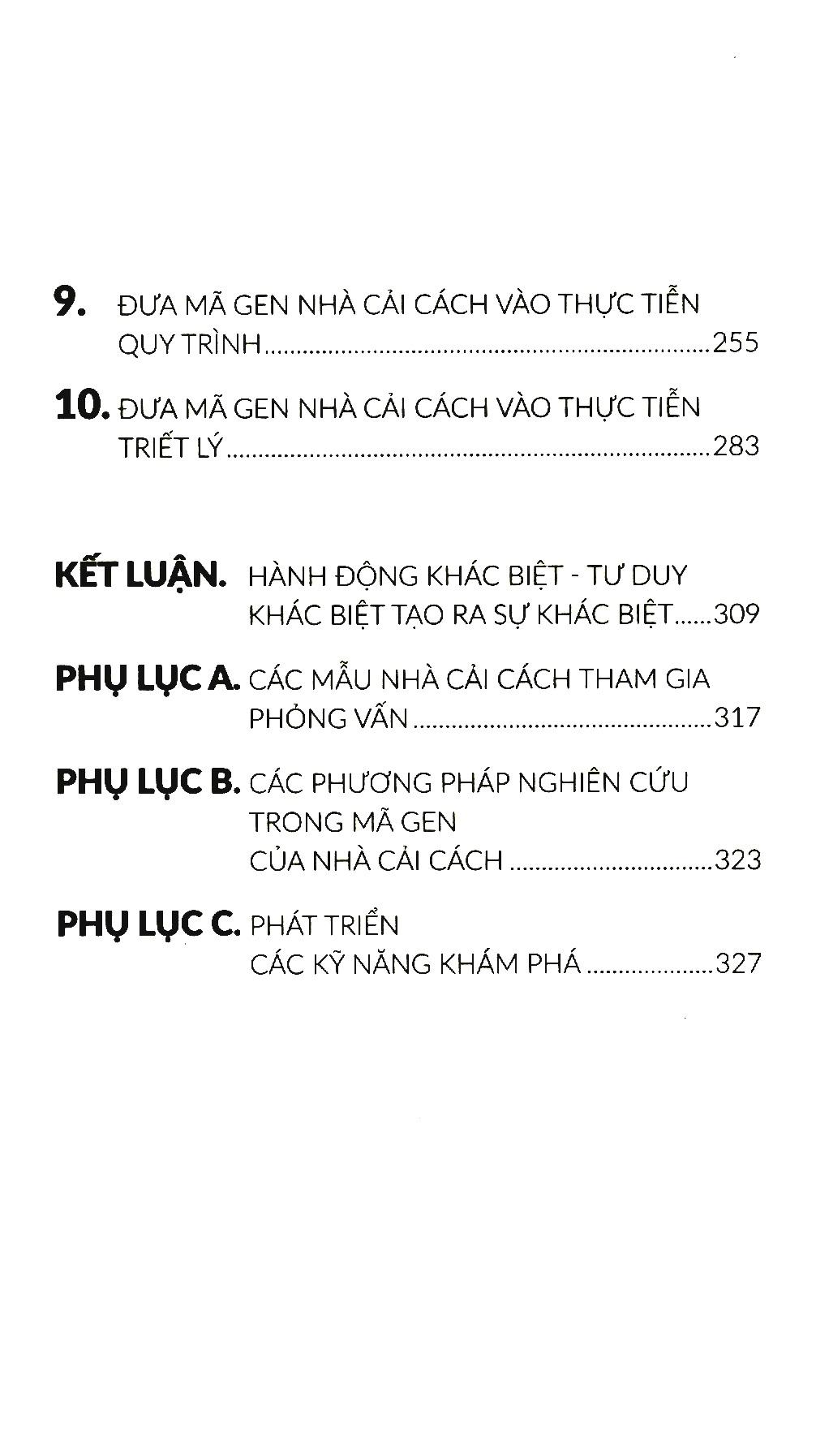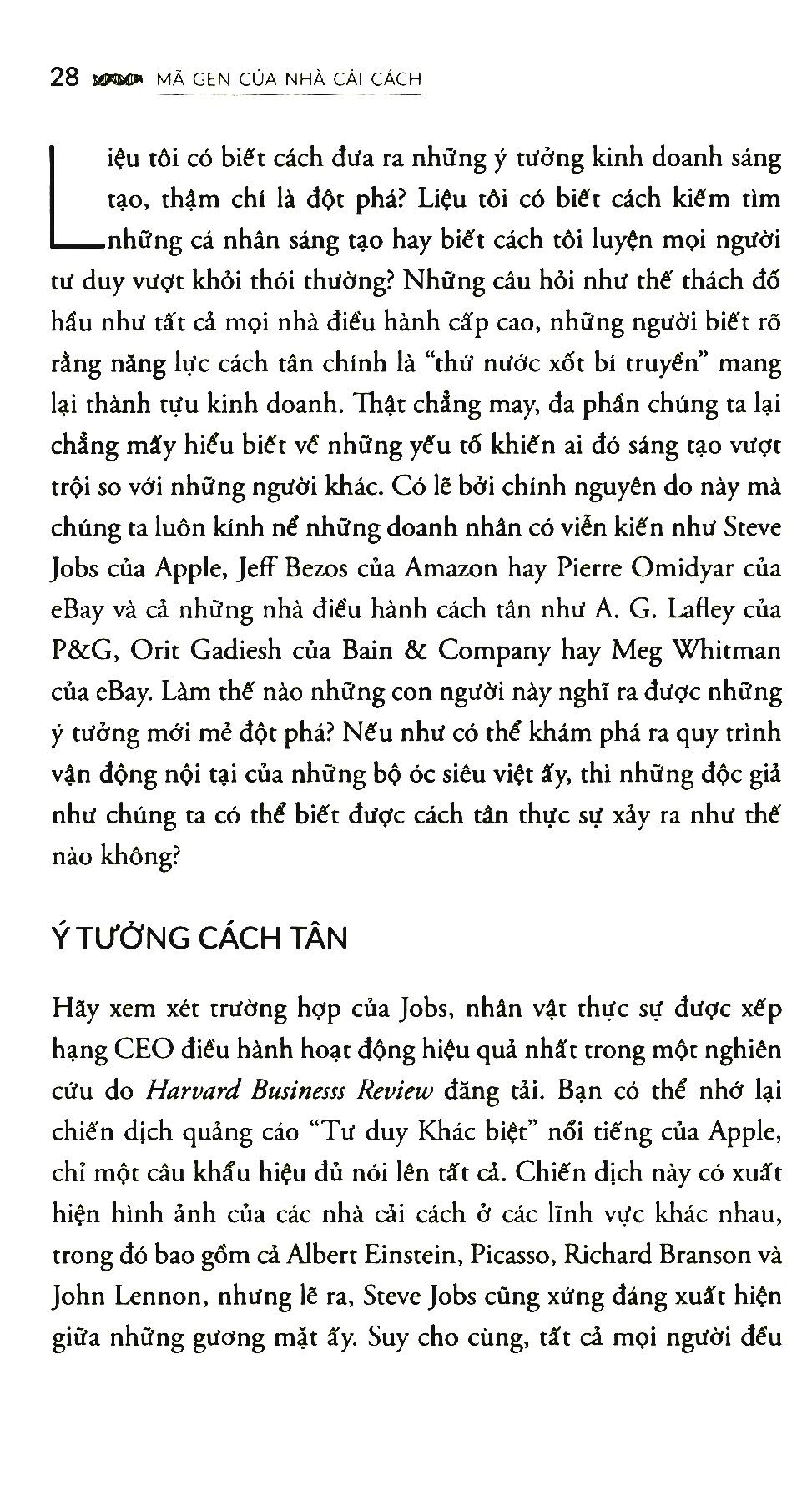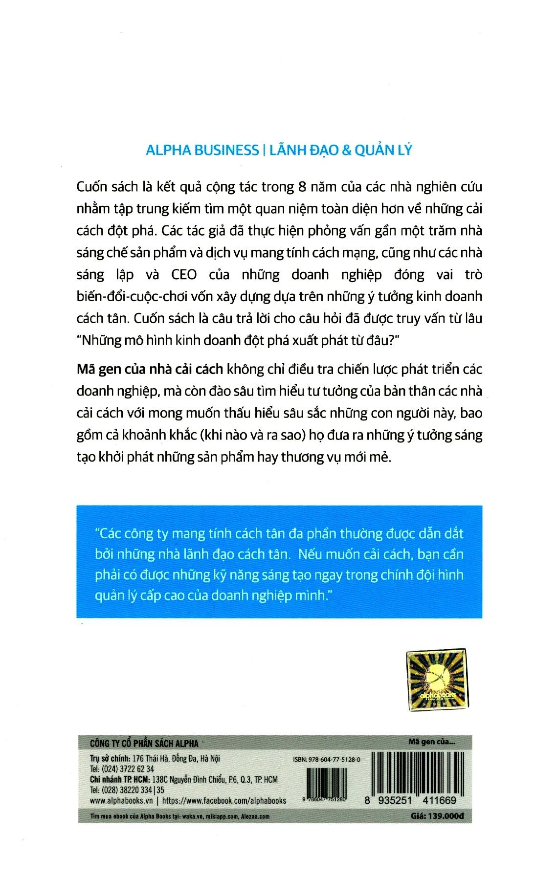 Mã Gen Của Nhà Cải Cách (Tái Bản 2018) Cách tân - đó chính là nhân tố cốt tử của nền kinh tế toàn cầu, đồng thời là ưu tiên chiến lược của hầu như mọi CEO trên toàn thế giới. Trên thực tế, một khảo sát gần đây của hãng IMB thực hiện với 500 CEO đã nhận diện “khả năng sáng tạo” là vị trí “năng lực lãnh đạo” số một của tương lai. Sức mạnh của những ý tưởng cách tân nhằm cách mạng hóa các ngành nghề, lĩnh vực cũng như sản sinh ra thịnh vượng đã quá ư rõ ràng suốt chiều dài lịch sử: Chiếc iPod của hãng Apple vượt mặt Walkman của Sony, hạt cà phê cùng bầu không khí của Starbucks nhấn chìm các tiệm cà phê truyền thống, Skype vận dụng chiến lược “miễn phí” để đánh bại AT&T cùng Tập đoàn Viễn thông Anh quốc (British Telecom), eBay nghiền nát những quảng cáo phân loại, còn hãng Hàng không giá rẻ Southwest Airlines thì cất cánh ngay bên dưới tầm thống trị của America Airlines và Delta Airlines. Trong mọi ví dụ, những ý tưởng sáng tạo của các doanh nghiệp cách tân đều cho ra lợi thế cạnh tranh mạnh mẽ cùng của cải kếch xù cho công ty nào giành phần tiên phong. Hẳn nhiên là, câu hỏi đáng giá cả triệu đô khi nhìn lại, làm thế nào họ đạt được những điều như vậy? Và có lẽ câu hỏi trị giá cả chục triệu đô khi hướng tới tương lai là, làm thế nào tôi thực hiện được điều đó? Mã gen của nhà cải cách thảo luận chính những câu hỏi căn cốt này – và còn hơn thế nữa. Là kết quả của một công trình nghiên cứu kéo dài suốt tám năm trời của nhiều tác giả, trong đó mọi người cùng nhau kiếm tìm một quan niệm toàn diện hơn về các nhà cải cách đột phá – họ là ai và những doanh nghiệp cách tân mà họ sáng tạo nên là gì, cuốn sách sẽ hé mở nguồn gốc của những ý tưởng kinh doanh cách tân – và thường là, mang tính đột phá. phỏng vấn gần một trăm nhà sáng chế các sản phẩm và dịch vụ mang tính cách mạng, cũng như các nhà sáng lập và CEO của những doanh nghiệp đóng vai trò biến-đổi-cuộc-chơi vốn xây dựng dựa trên những ý tưởng kinh doanh cách tân. Mục tiêu của cuốn sách không nhằm vào việc điều tra chiến lược các doanh nghiệp, mà hơn thế, là đào sâu tìm hiểu tư tưởng của bản thân các nhà cải cách với mong muốn thấu hiểu tối đa  những con người này, bao gồm trong đó cả khoảng khắc (khi nào và ra sao) họ đưa ra những ý tưởng khởi phát những sản phẩm hay doanh vụ mới mẻ.