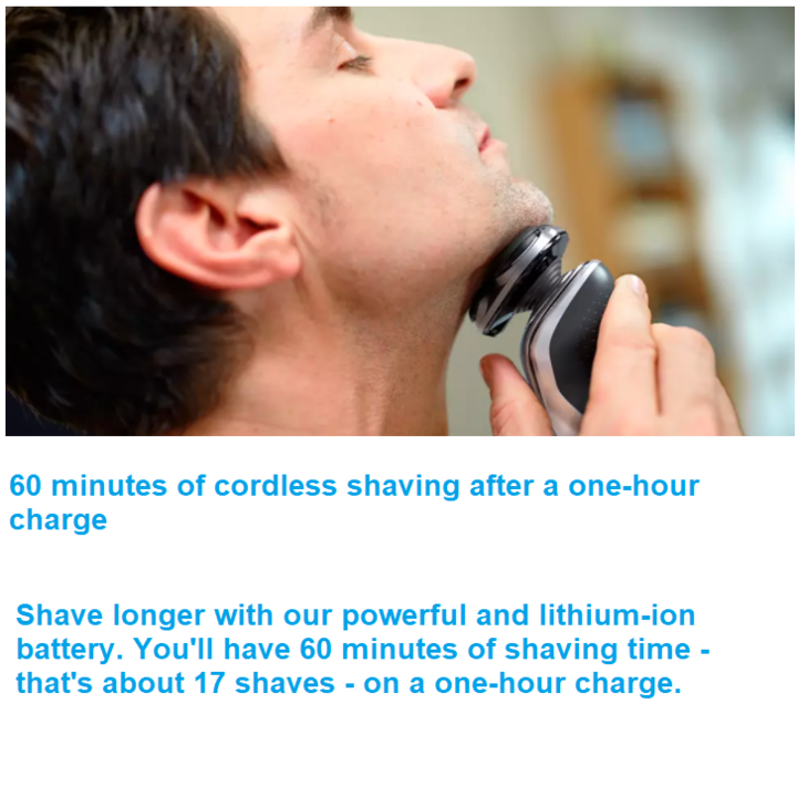- Khi sạc pin trong 1 giờ, bạn sẽ có tối đa 60 phút để cạo râu, tương đương với 17 lần cạo. Bên cạnh đó bạn cũng có thể sạc nhanh trong 5 phút cho một lần cạo khi cần gấp. Đèn tích hợp 3 mức pin chỉ báo và đèn báo khóa